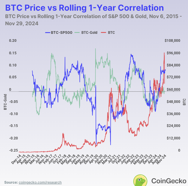 ในส่วนของทองคำ ความสัมพันธ์ของ Bitcoin กับทองคำมีความสัมพันธ์แบบตรงกันข้ามกับความสัมพันธ์ของมันกับ S&P 500 สิ่งนี้ชี้ให้เห็นว่าแม้ทั้งคู่จะถูกมองว่าเป็นการลงทุนทางเลือก แต่ Bitcoin และทองคำ (เส้นสีเขียว) มักมีการเคลื่อนไหวเป็นอิสระต่อกัน นอกจากนี้ ความสัมพันธ์ดังกล่าวยังมีการเปลี่ยนแปลงไปในทิศทางตรงกันข้ามกับราคาของ Bitcoin เมื่อราคาสูงขึ้น ความสัมพันธ์จะลดลง และในทางกลับกัน สิ่งนี้แสดงให้เห็นว่าเมื่อ Bitcoin มีผลการดำเนินงานที่ไม่ดี นักลงทุนมักเปลี่ยนไปลงทุนในทองคำ อย่างไรก็ตาม ในช่วงเหตุการณ์เศรษฐกิจมหภาค ความสัมพันธ์มักมีการเพิ่มขึ้นชั่วคราว สะท้อนถึงการตอบสนองของทั้งสองสินทรัพย์ต่อสภาวะตลาดคล้ายๆ กัน ถึงกระนั้น Bitcoin ยังไม่สามารถยืนยันสถานะของตัวเองในฐานะ "ทองคำดิจิทัล" ได้อย่างสมบูรณ์