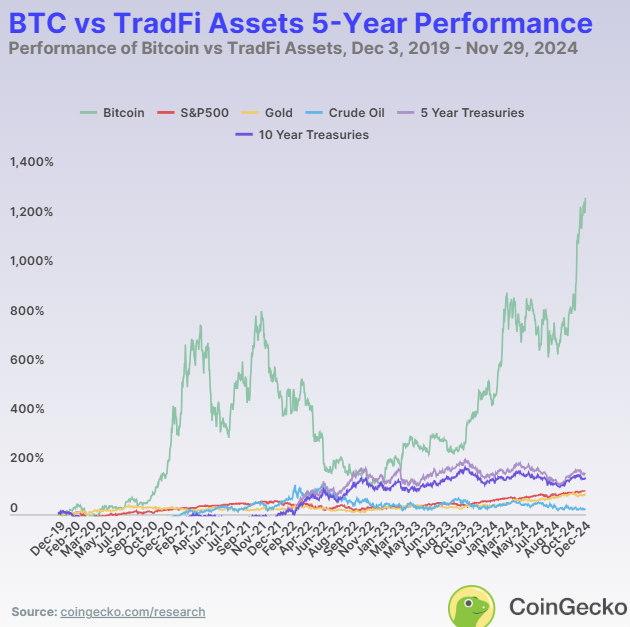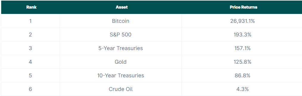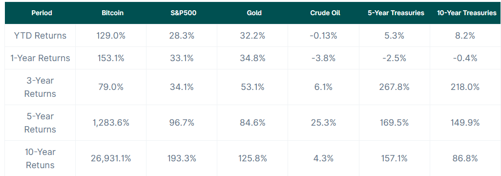 ข้อมูลช่วง 5 ปีที่ผ่านมาแสดงให้เห็นว่าประสิทธิภาพของ Bitcoin แข็งแกร่งที่สุด โดยมีอัตราผลตอบแทนถึง 1283.6% ดัชนี S&P 500 และทองคำยังคงมีความเสถียร โดยมีอัตราผลตอบแทนอยู่ที่ 96.7% และ 84.6% ตามลำดับ พันธบัตรรัฐบาลสหรัฐฯ ก็มีผลตอบแทนที่ดีเช่นกัน โดยพันธบัตรอายุ 5 ปีมีอัตราผลตอบแทน 157.1% และพันธบัตรอายุ 10 ปีมีอัตราผลตอบแทน 149.9% ส่วนราคาน้ำมันดิบเพิ่มขึ้นเพียง 25.3% ซึ่งทำให้มีความน่าสนใจในการลงทุนระยะยาวต่ำกว่ามาก ข้อมูลในช่วงนี้สะท้อนให้เห็นว่า Bitcoin มีศักยภาพในการสร้างผลตอบแทนที่มหาศาลในระยะกลาง ขณะที่หุ้นและทองคำมีการเติบโตอย่างมั่นคงและสมดุลกับ Bitcoin