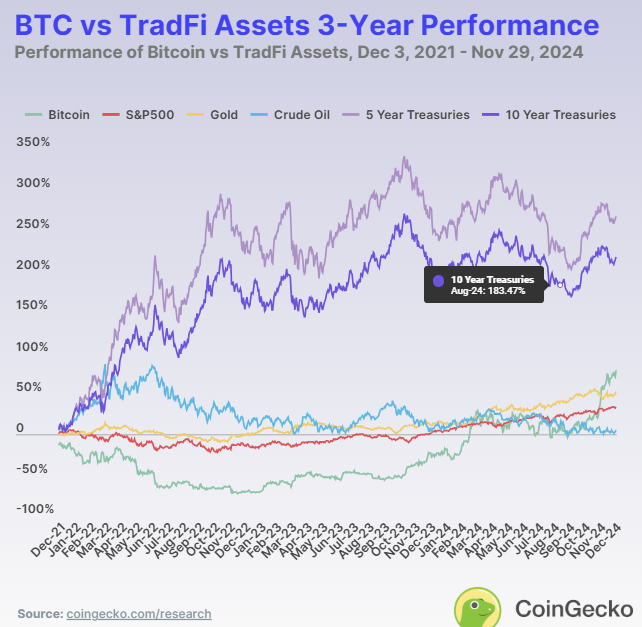 ในช่วงเวลา 3 ปี รูปแบบประสิทธิภาพของตลาดเปลี่ยนไป โดยเสถียรภาพทางเศรษฐกิจกลายเป็นปัจจัยสำคัญที่ทำให้พันธบัตรได้รับความนิยมสูงสุด พันธบัตรรัฐบาลสหรัฐฯ เป็นผู้นำ โดยพันธบัตร 5 ปีให้ผลตอบแทน 267.8% และพันธบัตร 10 ปีตามมาอย่างใกล้ชิดที่ 218% Bitcoin มีผลตอบแทนที่โดดเด่นไม่แพ้กันในช่วงเวลาเดียวกันที่ 79% ในขณะที่ทองคำให้ผลตอบแทนที่มั่นคงที่ 53.1% โดยมอบความปลอดภัยในช่วงที่ตลาดไม่แน่นอน น้ำมันดิบเป็นสินทรัพย์ประเภทเดียวที่มีผลตอบแทนต่ำกว่าสินทรัพย์ประเภทอื่นในช่วงเวลาเดียวกัน โดยอยู่ที่เพียง 6.1%