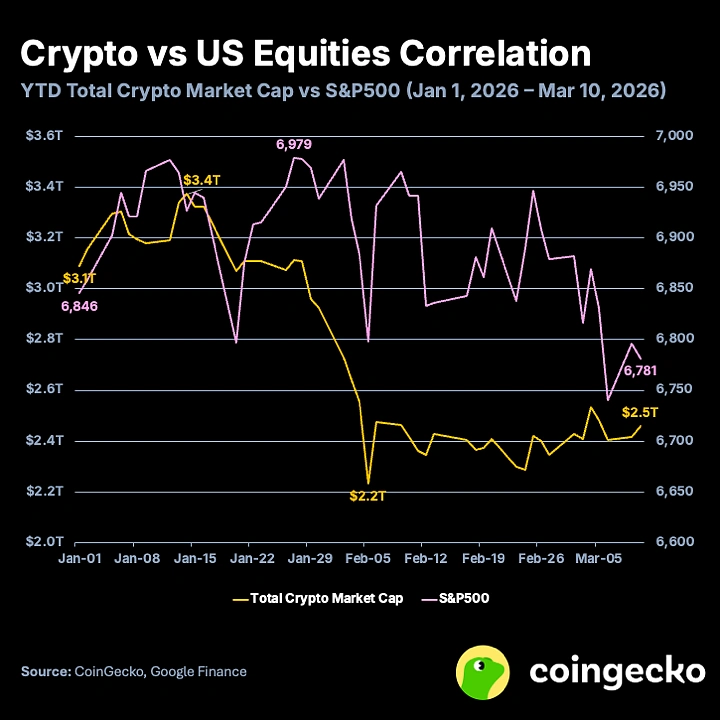 จนถึงขณะนี้ในปี 2026 ความสัมพันธ์ระหว่างคริปโตเคอร์เรนซีกับดัชนี S&P 500 และทองคำแสดงให้เห็นถึงความสัมพันธ์เพียงปานกลาง ซึ่งอาจเป็นสัญญาณว่าในที่สุดสินทรัพย์ประเภทนี้กำลังเริ่ม "แยกตัวออก"