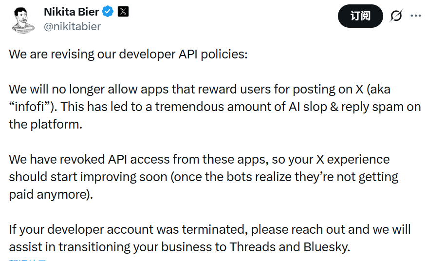 เมื่อวันที่ 16 มกราคมนิคิตาได้สร้างความตกตะลึงอย่างมาก โดยประกาศว่า X ได้ปรับนโยบาย API สำหรับนักพัฒนา โดยจะไม่อนุญาตแอปประเภท "infofi" (กลไกที่ให้รางวัลแก่ผู้ใช้ในการโพสต์) อีกต่อไป และยังเพิกถอนการเข้าถึง API ของแอปเหล่านี้ทันที