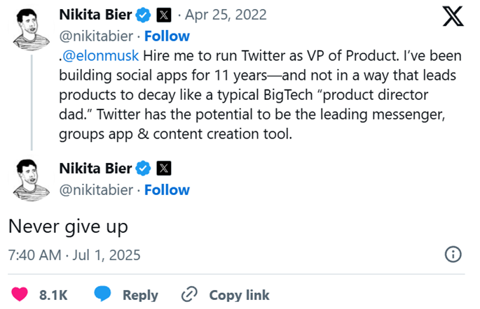 ในปี 2022 นิคิตา บิเอร์ ได้เสนอตัวเองต่อ มัสก์ ให้ดำรงตำแหน่งหัวหน้าฝ่ายผลิตภัณฑ์ของทวิตเตอร์บน Xหลังเข้ารับตำแหน่ง เขาก็เริ่มทำงานอย่างจริงจังอีกครั้ง ทำฟีเจอร์ต่างๆ มากมาย ที่นี่ขอแนะนำรายการสั้นๆ ดังนี้: ในช่วงต้นเดือนกรกฎาคม ปรับปรุงฟีดหลัก (core feed) ช่วงเดือนตุลาคม แสดงตัวอย่างฟีเจอร์ชุมชน ในเดือนมกราคมปี 2026 เป็นจุดสูงสุด—ร่วมมือกับทีมอัลกอริทึม เพื่อปรับเปลี่ยนหน้าแนะนำ (recommendation page) เพื่อเพิ่มสัดส่วนเนื้อหาจากเพื่อน ผู้ติดตามร่วมกัน และผู้ติดตาม พร้อมกันนี้ยังเปิดตัวฟีเจอร์ Smart Cashtags (แสดงราคาหุ้นแบบเรียลไทม์ + การอภิปราย) การซิงค์ร่างงาน (จากแอปไปยังเว็บไซต์) และการต่อต้านเนื้อหาขยะจาก AI เป็นต้น