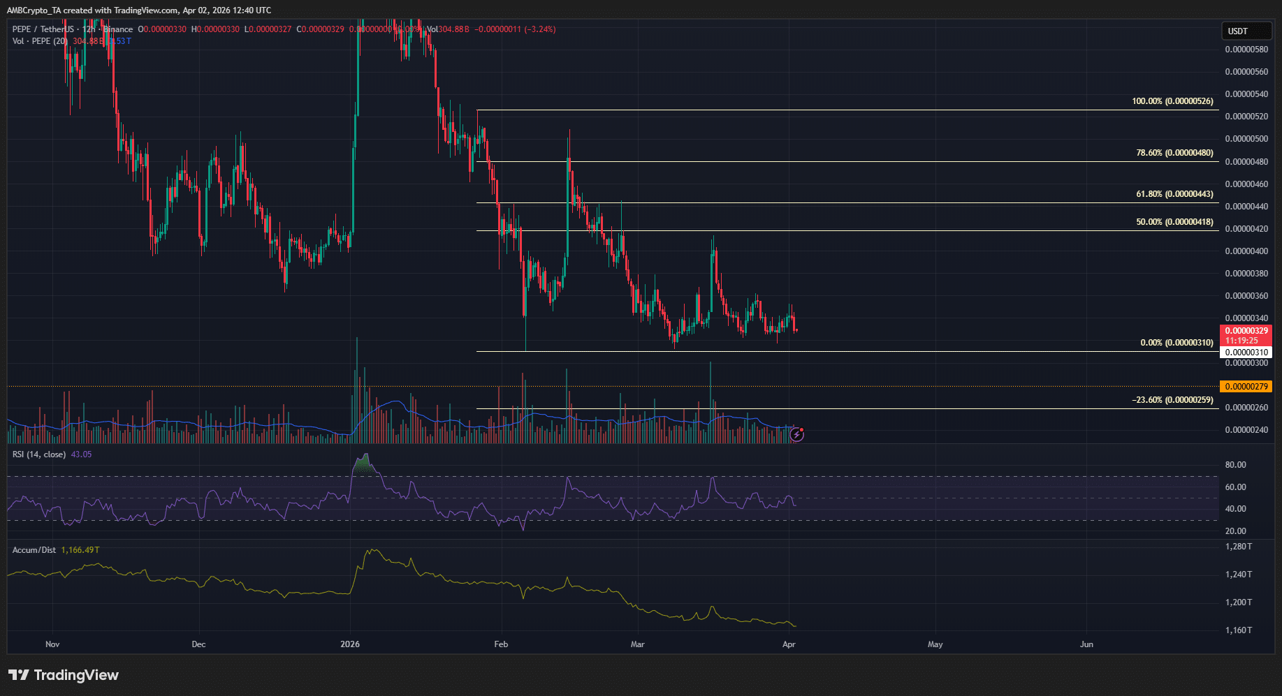 เป็นความจริงที่ระดับต่ำสุดปัจจุบันที่ $0.0000031 มีความสำคัญและมีมานับตั้งแต่กุมภาพันธ์ 2026 ในขณะเดียวกัน แนวโน้มขาลงก็รุนแรงมาก