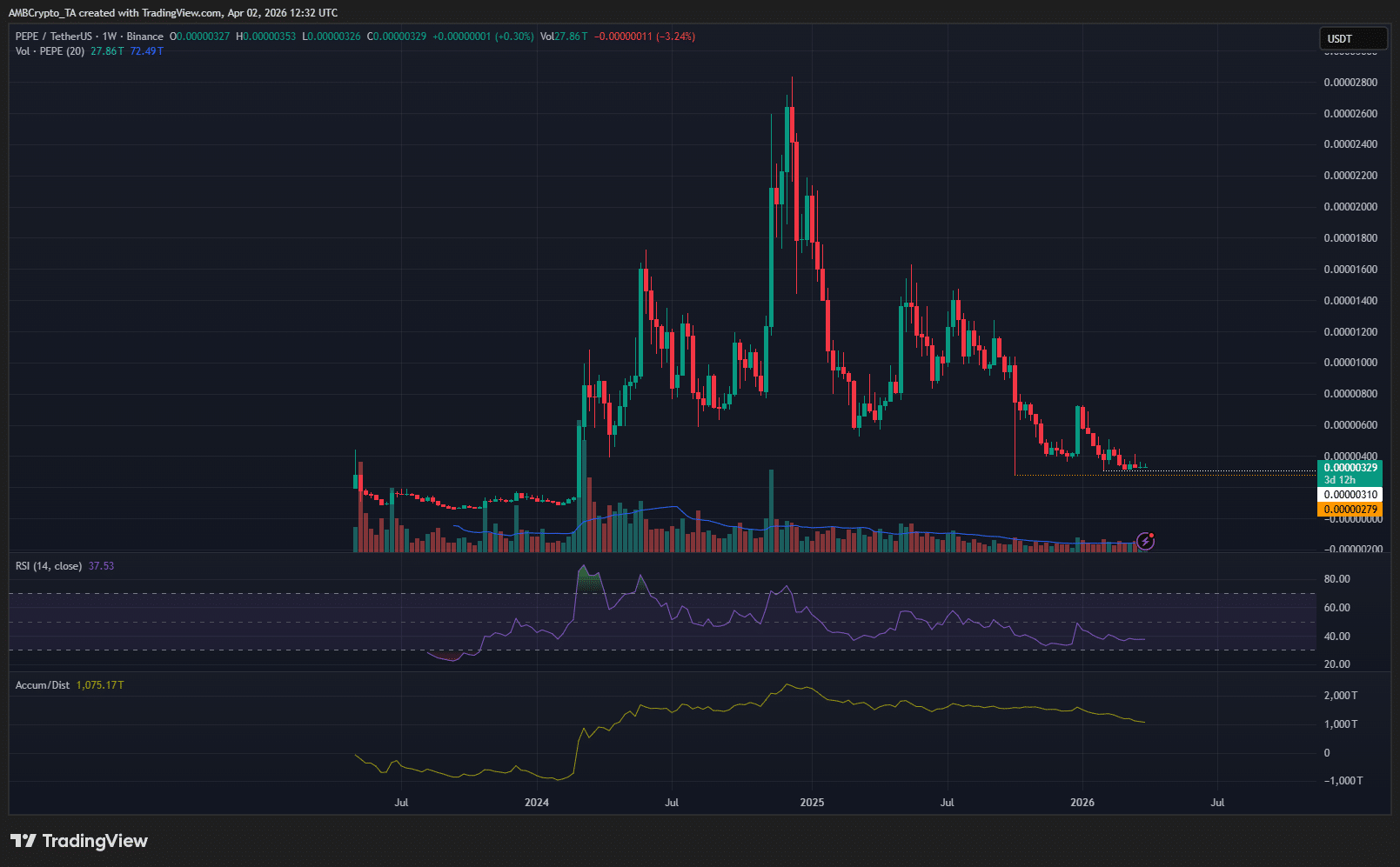 น่าเสียดายที่แนวโน้มไม่ได้เป็นมิตรกับผู้ซื้อ PEPE แผนภูมิรายสัปดาห์แสดงให้เห็นแนวโน้มขาลงที่กำลังเกิดขึ้น การป้องกันบริเวณ $0.0000028-$0.0000031 ในช่วงสองเดือนที่ผ่านมาอาจไม่ได้หมายความว่าจะมีการฟื้นตัวอย่างมีนัยสำคัญเกิดขึ้น