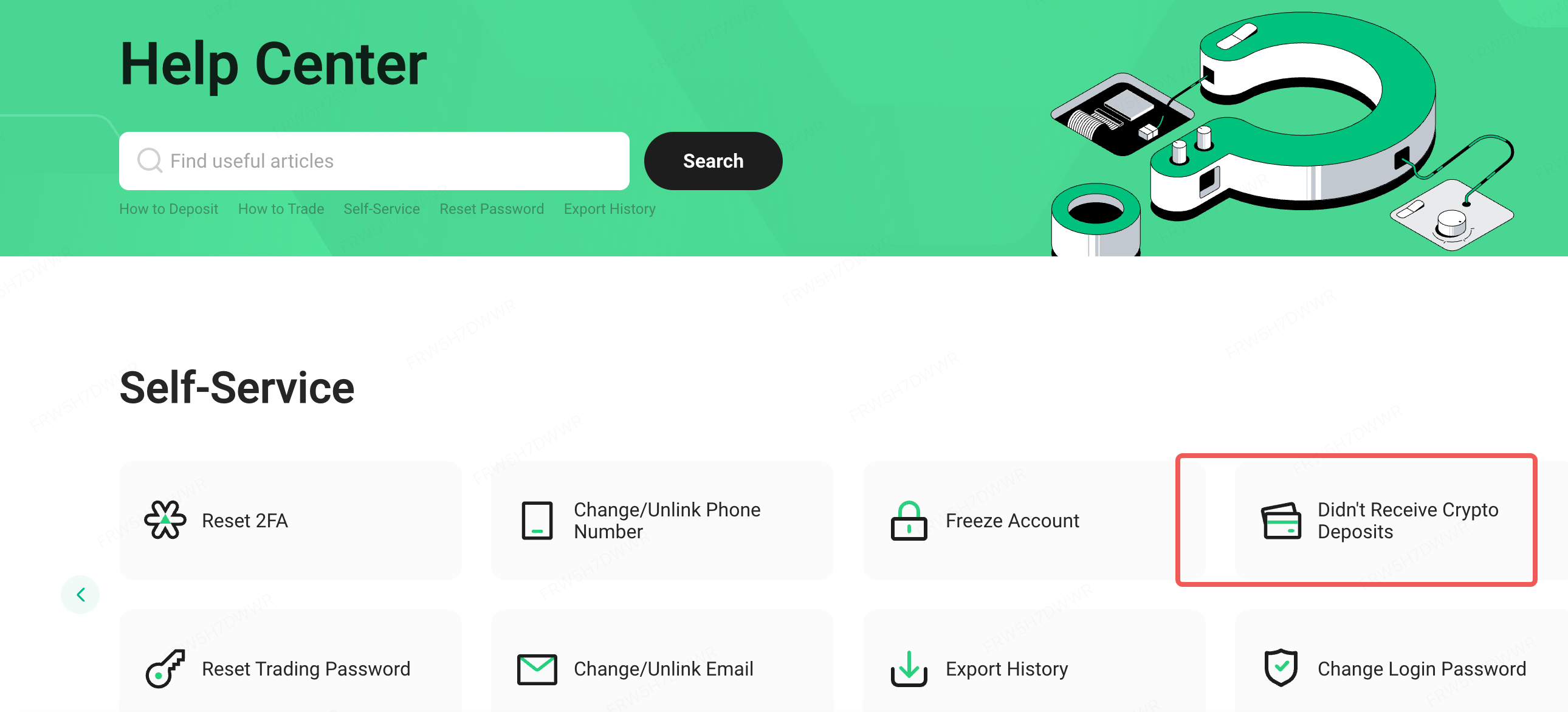 ➡️ ก่อนอื่น ตรวจสอบให้แน่ใจว่าคุณได้ลงชื่อเข้าใช้บัญชี KuCoin ของคุณก่อนที่จะขอกู้คืนด้วยตนเอง จากนั้นไปที่หน้าศูนย์ช่วยเหลือและเลือก "ยอดฝากคริปโตไม่ได้เข้าบัญชี"