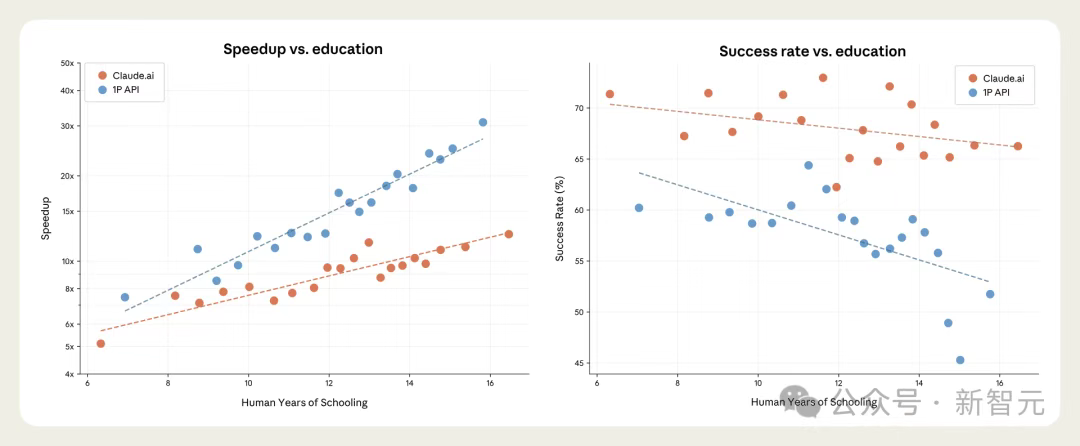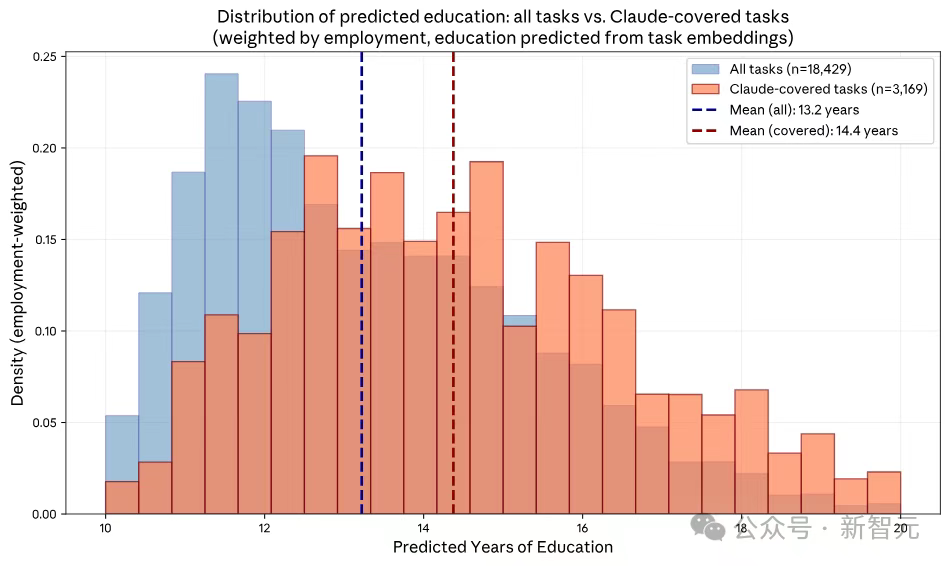 Veriler, Claude'un şu anda kapsadığı görevlerin, ortalama olarak 14,4 yıl eğitim gerektirdiğini göstermektedir (iki yıllık kolej derecesine denk), bu da genel ekonomik aktivitelerin ortalama 13,2 yıl gerektirmesinden çok daha yüksektir.