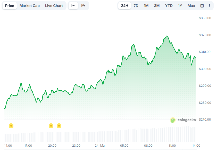 24 Mart'ta, kripto paranın fiyatı geçen dört ayın en yüksek seviyesi olan neredeyse 320 dolara yükseldi. Daha sonra bir miktar dinamik kaybetti ve şu anda yaklaşık 310 dolarda işlem görüyor, bu da günlük %10'luk bir artışa karşılık geliyor.