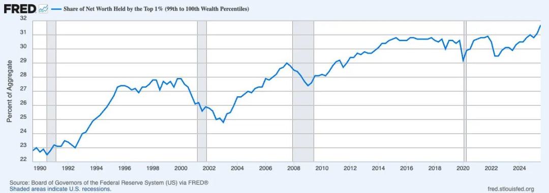 Daha doğru bir ifadeyle, sorun sadece gelir eşitsizliği değil, servet eşitsizliği. İnsanlık tarihi boyunca, en üstteki %1'in elinde bu kadar yüksek bir servet oranı hiç yoktu. ABD örneğinde, en üstteki %1'in elindeki net varlık payı sürekli artmakta olup, şu anda ulusal toplam servetin yaklaşık üçte birine ulaşmıştır.