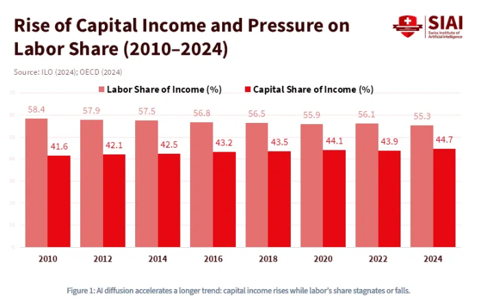 1980 yılından beri, ABD GSYİH'sindeki işgücü gelirlerinin oranı yaklaşık %65'ten %55'in altına düşmüştür ve bu, büyük dil modellerinin (LLM) yaygınlaşmadan önceydi. Goldman Sachs, 2023 yılında üretken yapay zekânın 300 milyon tam zamanlı işi otomasyon riskine maruz bırakabileceğini tahmin etti.