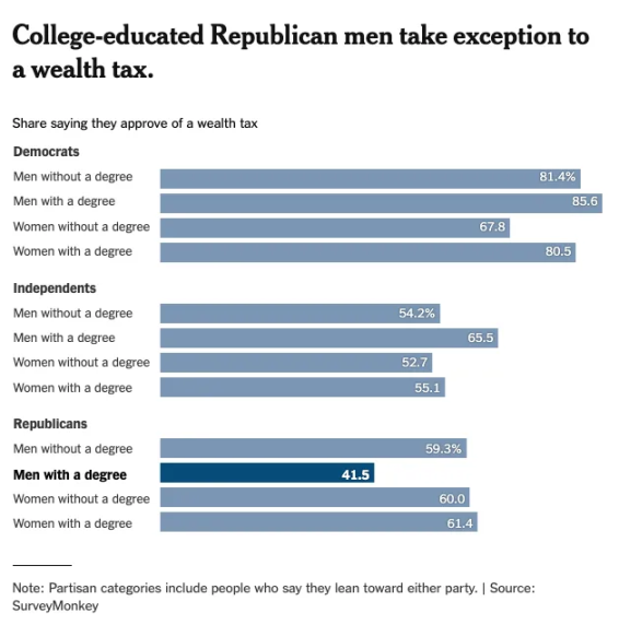 Kapitalizmin kökeni ve son siperine bakın — ABD. The New York Times’ın servet vergisiyle ilgili halk tutumu anketi, üniversite eğitimi almış erkekler (nüfusları hızla azalan bir grup) dışındaki tüm nüfus gruplarında servet vergisi desteğinin neredeyse aynı düzeyde olduğunu gösteriyor.