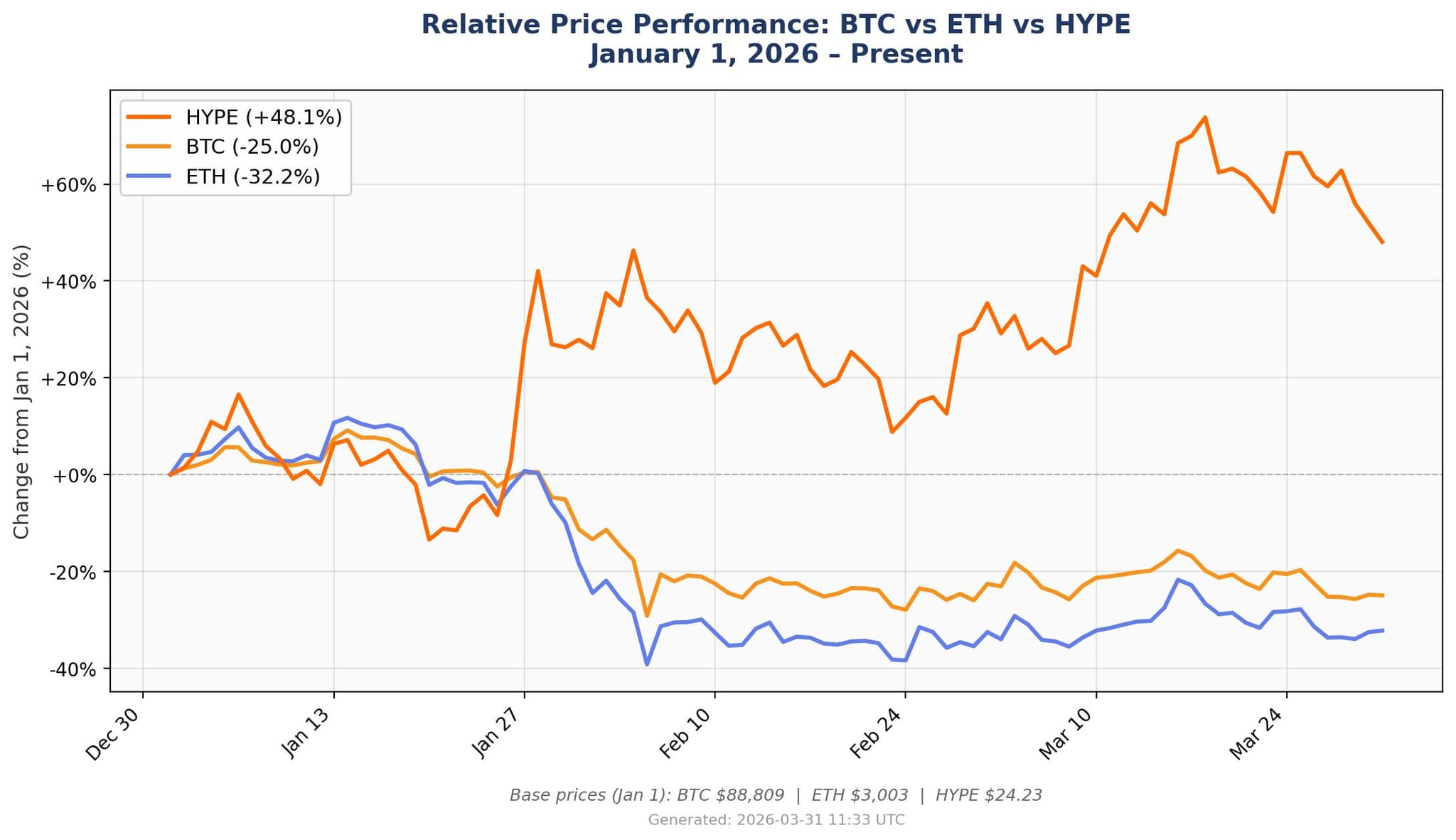Hyperliquid’in HYPE’si, Bitcoin [BTC] ve Ethereum [ETH] ile karşılaştırıldığında 2026 Birinci Çeyreği daha iyi yatırımcı getirileriyle kapattı. Bu altcoin, aynı dönemde %48’lik çeyreklik kazanç kaydederken, BTC %25 kaybetti ve ETH %32 düştü.