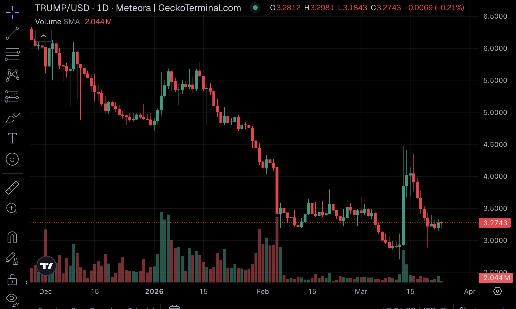 TRUMP token, 25 Nisan Mar-a-Lago karnaval duyurusundan sonra yaşanan volatiliteden kurtulup $3,27 lokal destek seviyesinin üzerinde konsolide oluyor. Token, 2025 yükseklerinin hâlâ önemli ölçüde altında olsa da, etkinliğe yaklaşırken hacim profilleri yenilenmiş ilgiyi gösteriyor.