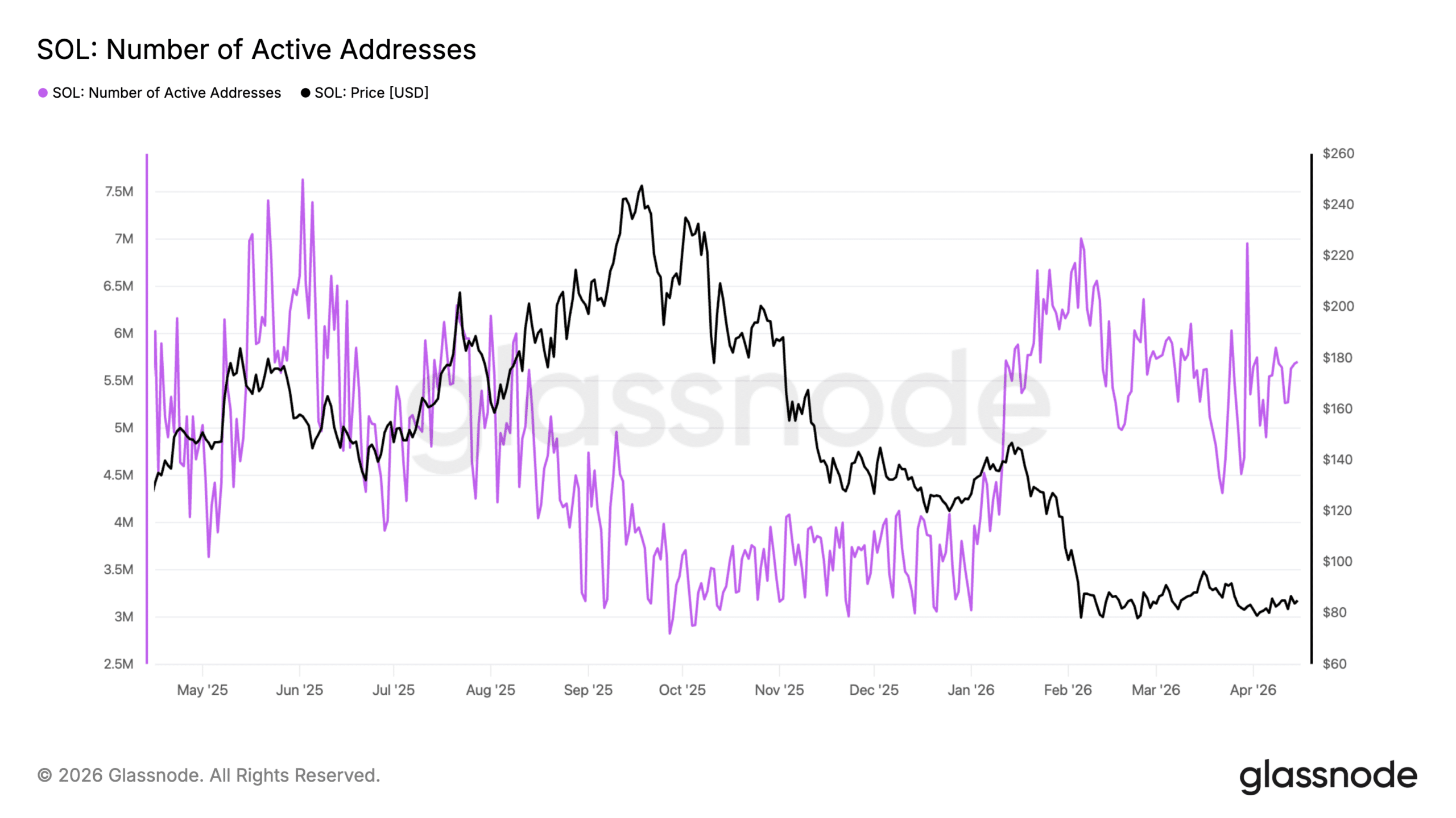 Solana'nın aktif adres sayısı, fiyat yavaşladığında bile sürekli olarak yüksek kaldı. Glassnode'e göre, yazım anında aktif adresler yaklaşık 5,5 milyon ile 5,8 milyon arasında idi.