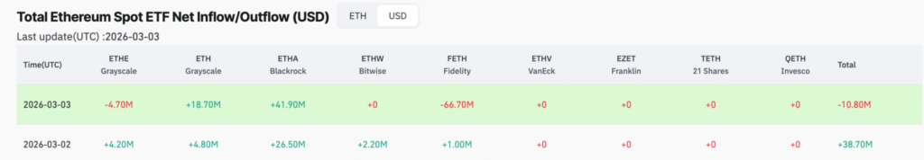 На всіх емітентів спот-ETF на ethereum зафіксували чистий притік у розмірі 38,70 мільйона доларів США 2 березня, а потім перейшли до чистого відтoku в розмірі 10,80 мільйона доларів США 3 березня. Незважаючи на це, BlackRock зберігала позитивну динаміку у своєму фонді ethereum.