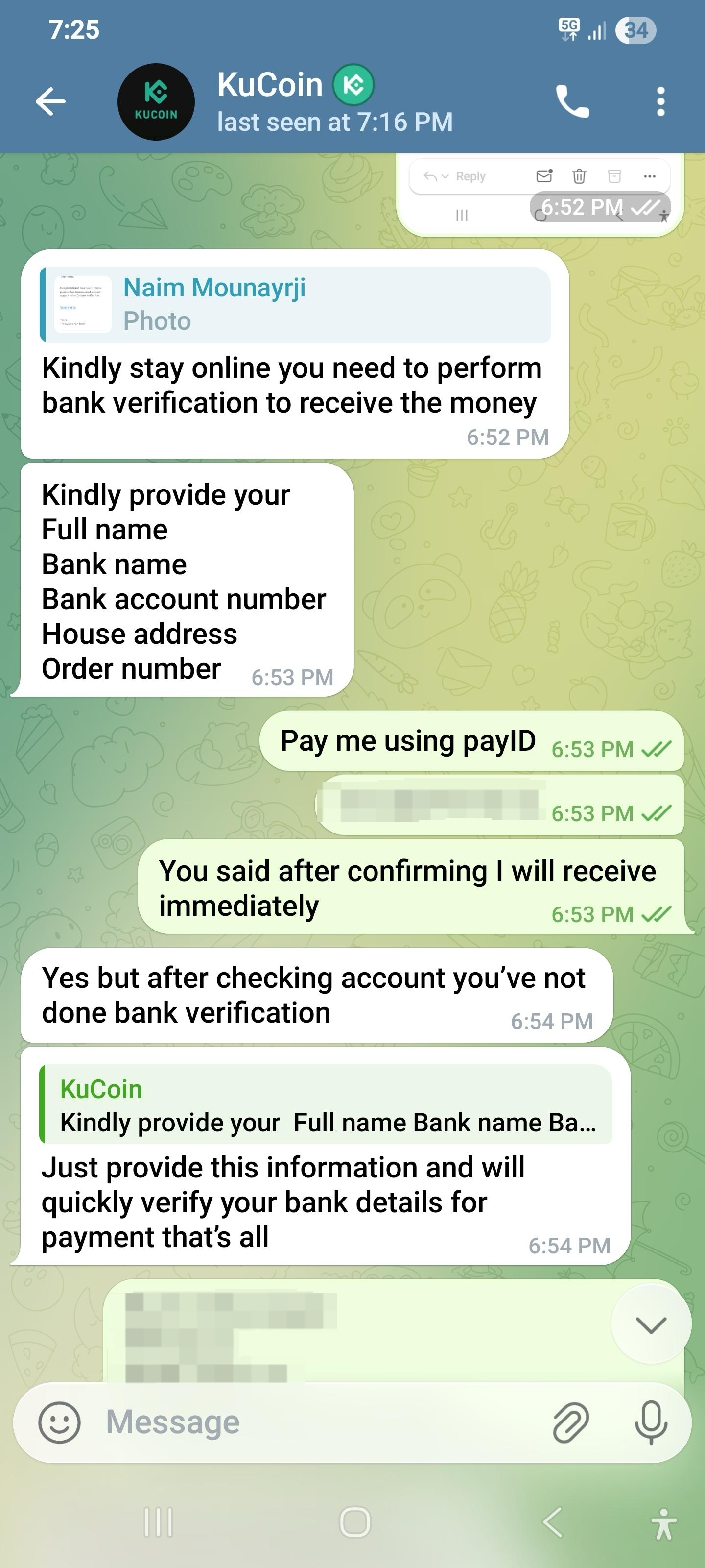 جب ٹریڈ پہلے ہی جاری تھی، خریدار نے اچانک ٹیلیگرام پر رابطہ کیا اور خود کو KuCoin کسٹمر سپورٹ ظاہر کیا۔