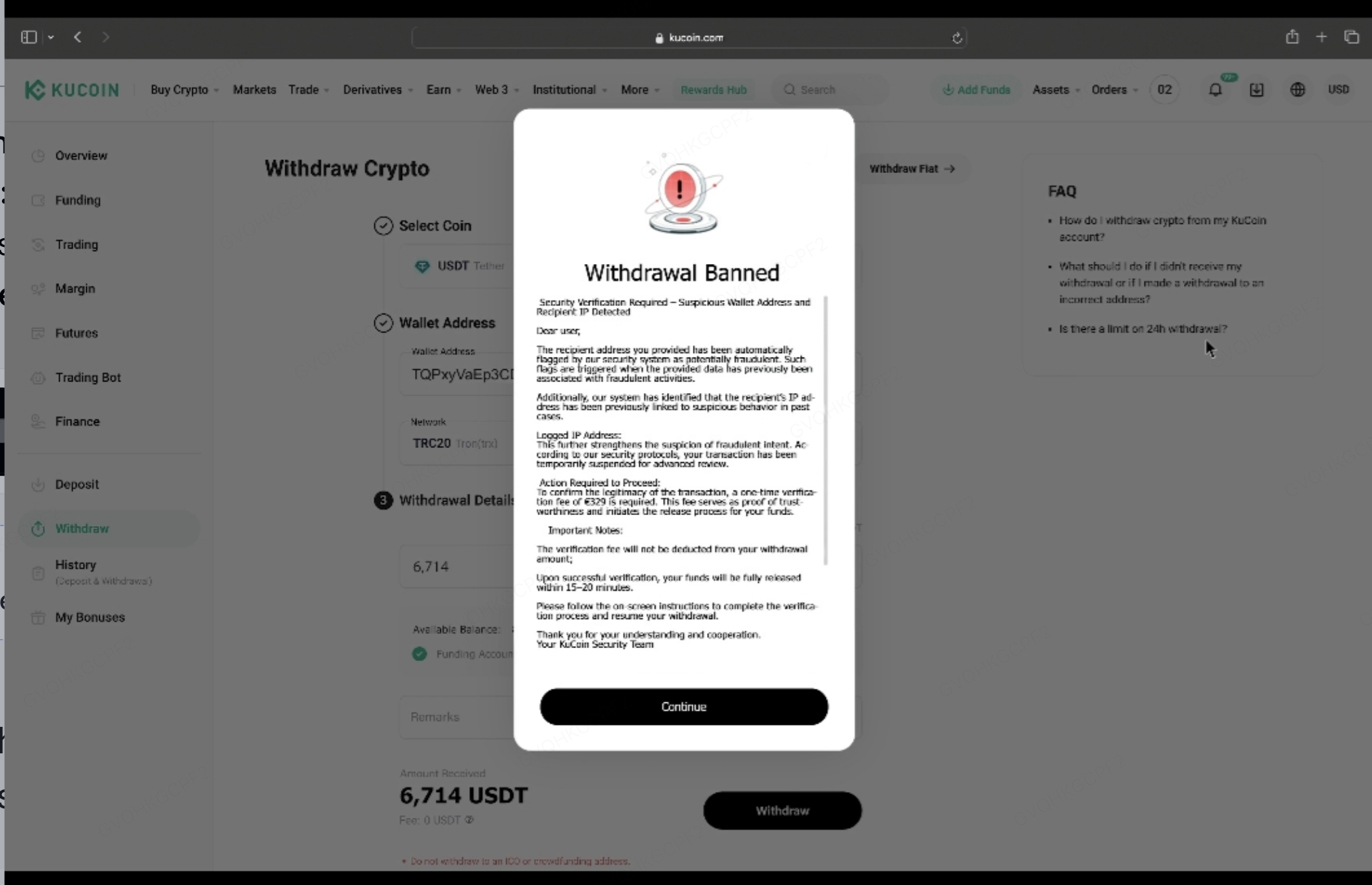 USDT نکلوانے کی درخواست کے بعد، ایک صارف کو ٹیلیگرام پر ایک پیغام ملا جو خود کو KuCoin سیکیورٹی ٹیم ظاہر کر رہا تھا۔