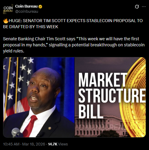 - اسٹیبل کوائن کی خبریں: سینیٹ بینکنگ چیئر ٹم سکاٹ کا خیال ہے کہ اس ہفتے کے آخر تک پہلا اسٹیبل کوائن ییلڈ مسودہ پیش کیا جائے گا۔