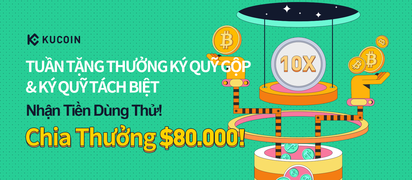 Tuần Tặng Thưởng Ký Quỹ Gộp & Ký Quỹ Tách Biệt KuCoin hiện đang diễn ra! Miễn phí nhận tiền dùng thử Ký quỹ! Giao dịch Ký quỹ Gộp và Ký quỹ Tách biệt để được chia thưởng 80.000 USDT!