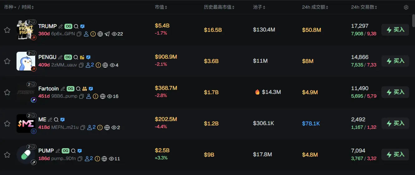 Top 5 đồng token nổi bật trên Solana trong 24 giờ qua lần lượt là: TRUMP, PENGU, Fartcoin, ME, PUMP