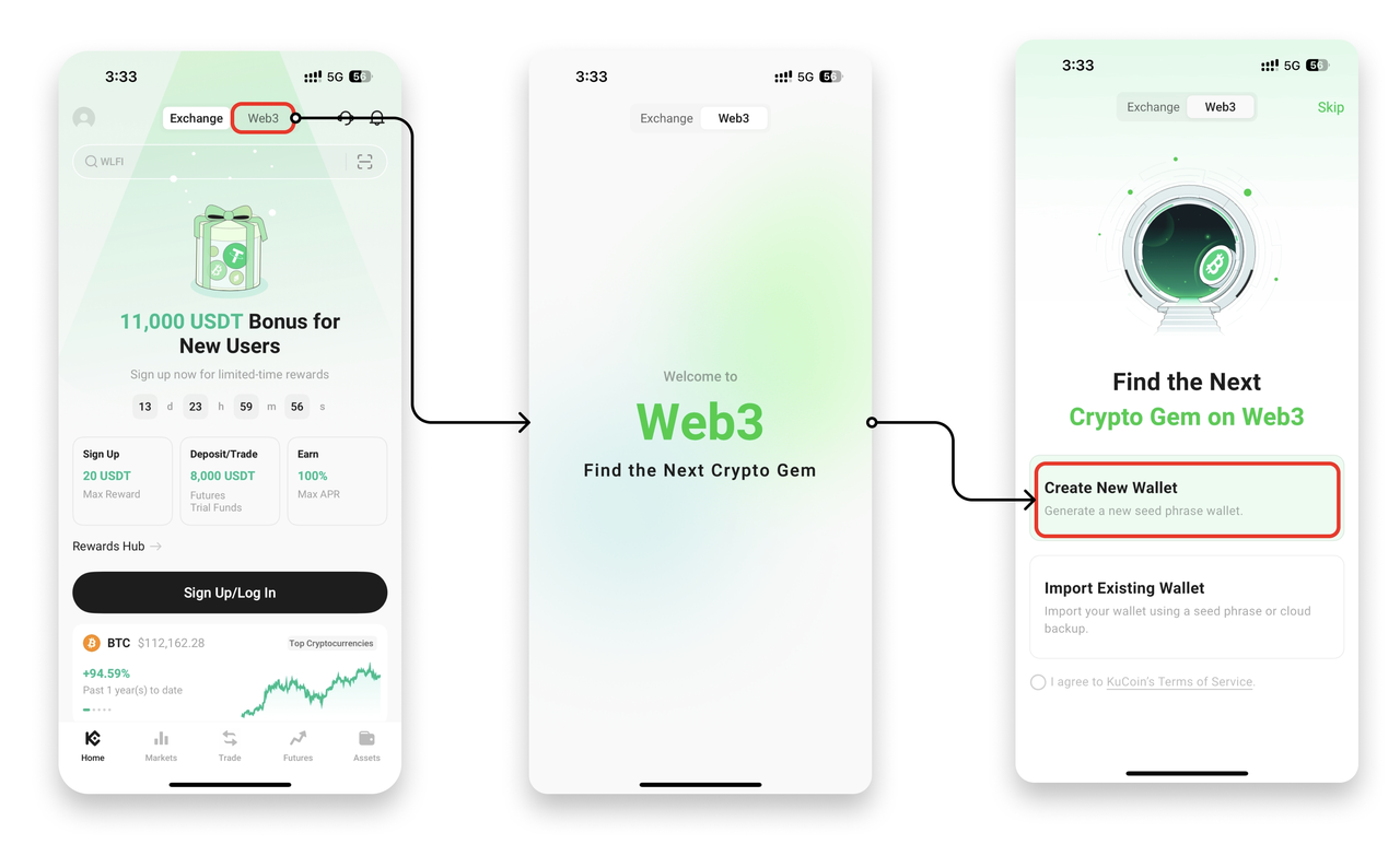 Open KuCoin app, go to Web3, and tap Create New Wallet.