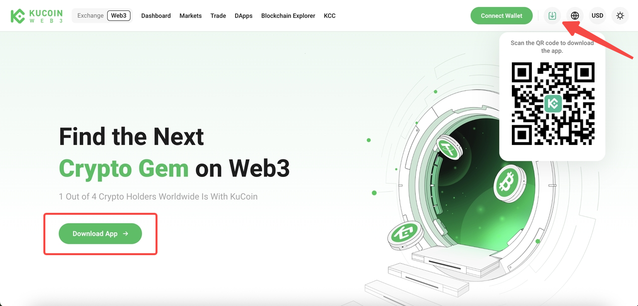 Visit the official KuCoin Web3 website and click Download App, or simply scan the QR code.