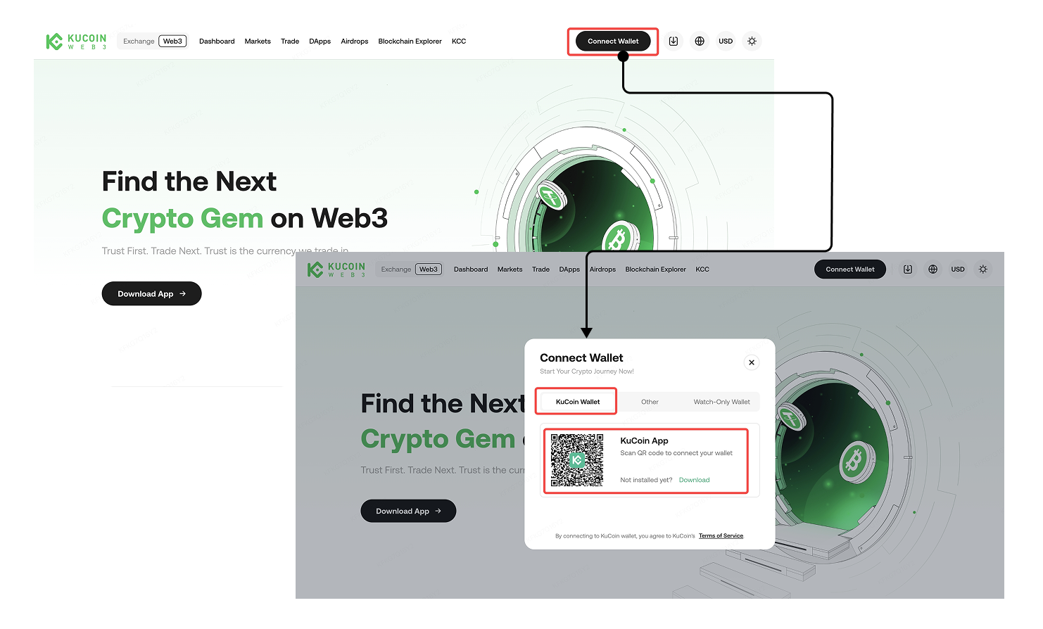 Please download the KuCoin App first, switch to Web3, and then connect your wallet by scanning the QR code with the KuCoin App.
