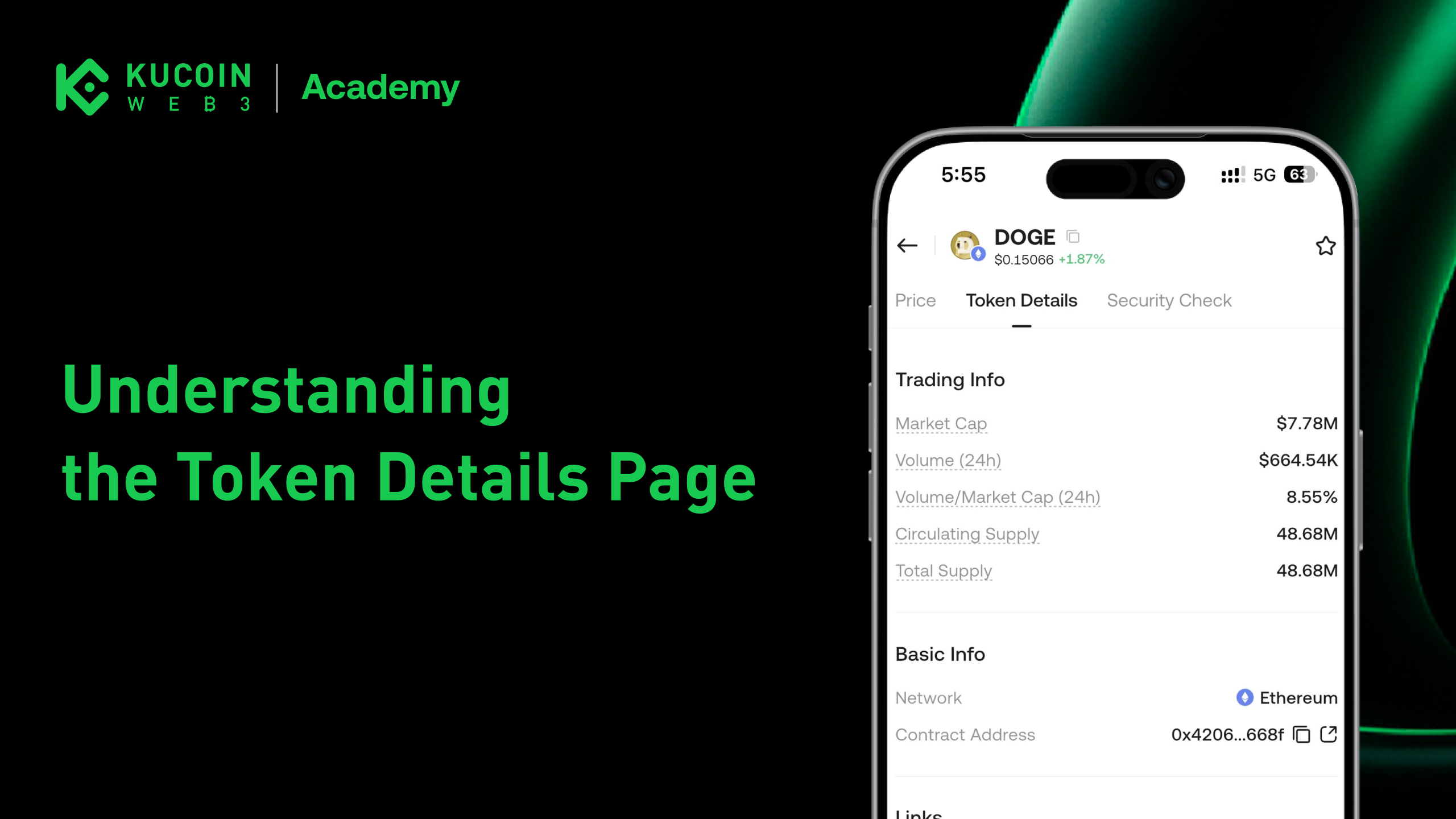 The Token Details Page in KuCoin Web3 Wallet provides a structured overview of key information for a specific token. It helps users verify token details, understand liquidity conditions, and security level before sending, swapping, or interacting with the asset.