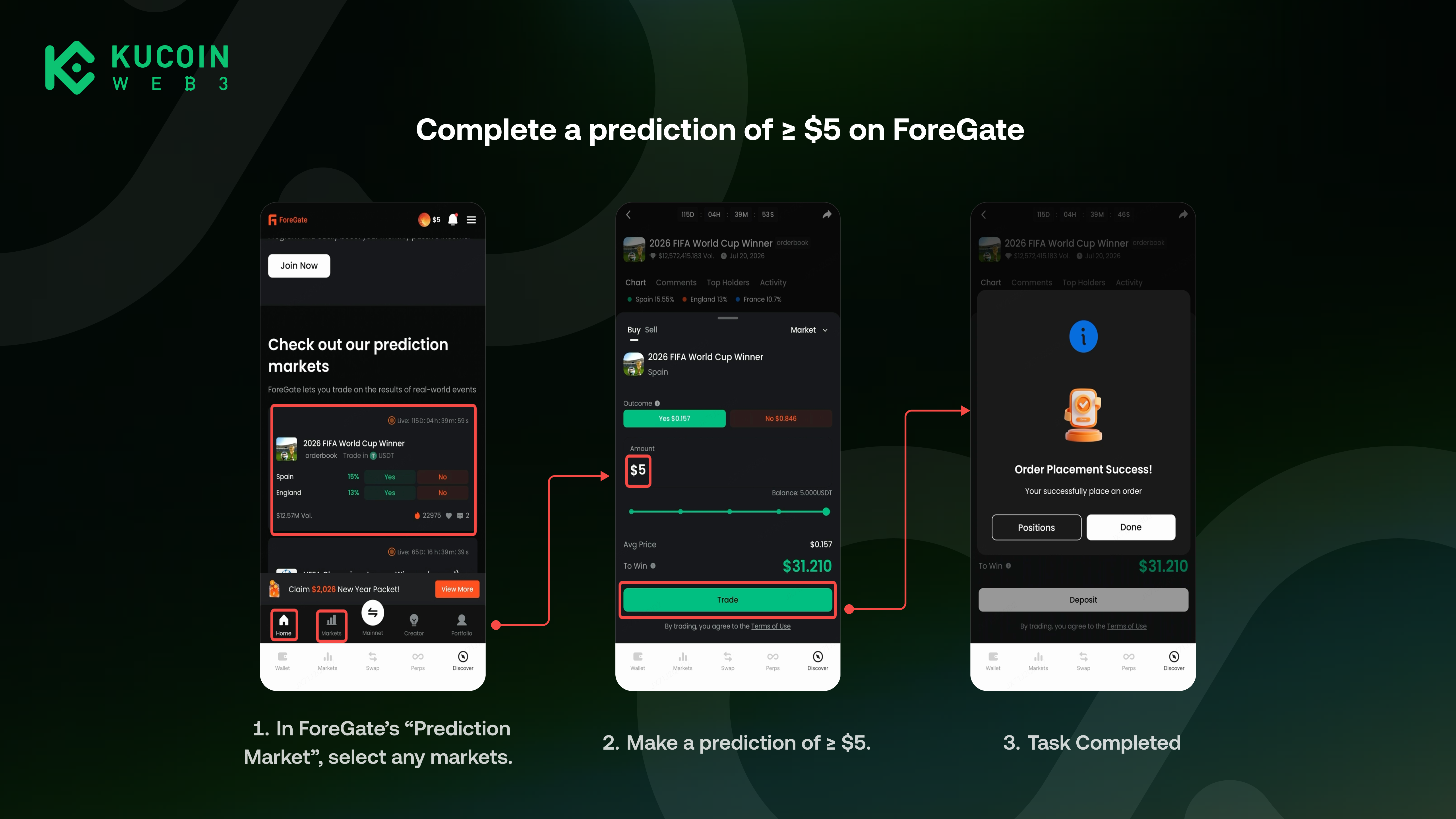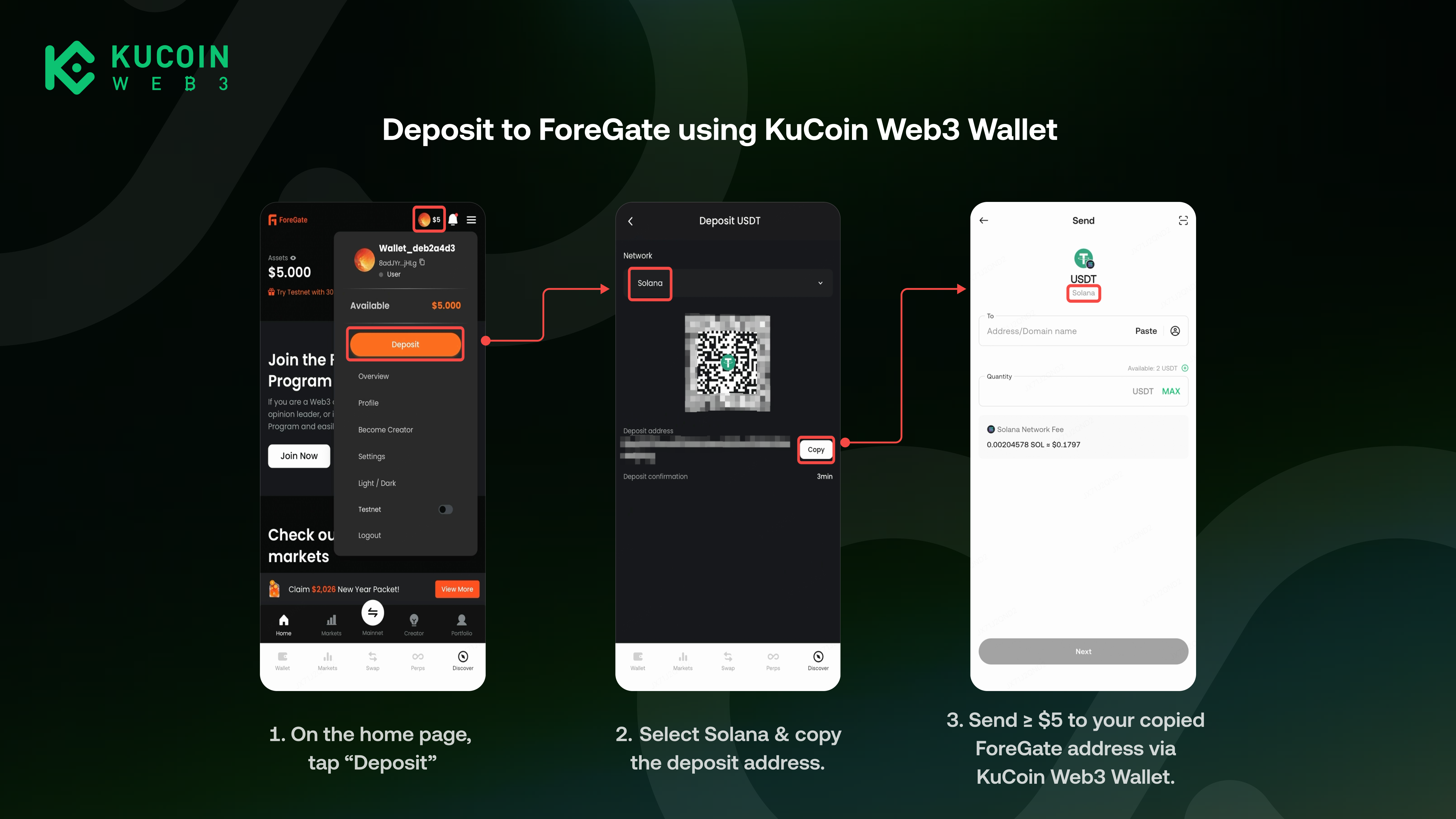 - Deposit ≥ $5 from your KuCoin Web3 Wallet to ForeGate;