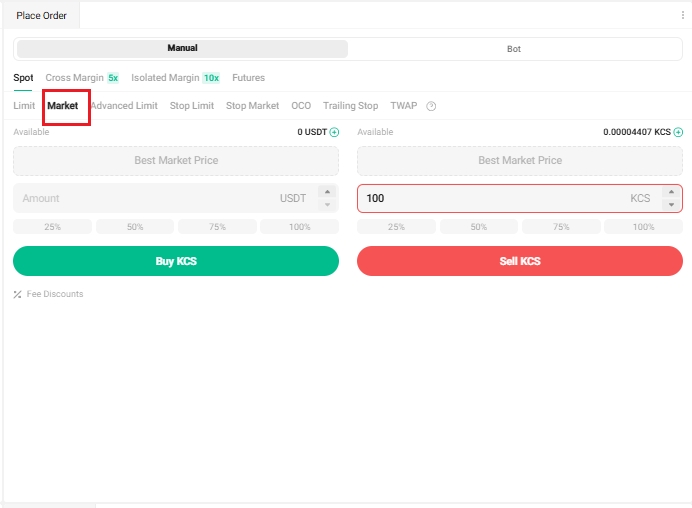 對於上述情況,您需要選擇市價,輸入100 KCS作為數量,然後點擊賣出KCS以確認訂單。