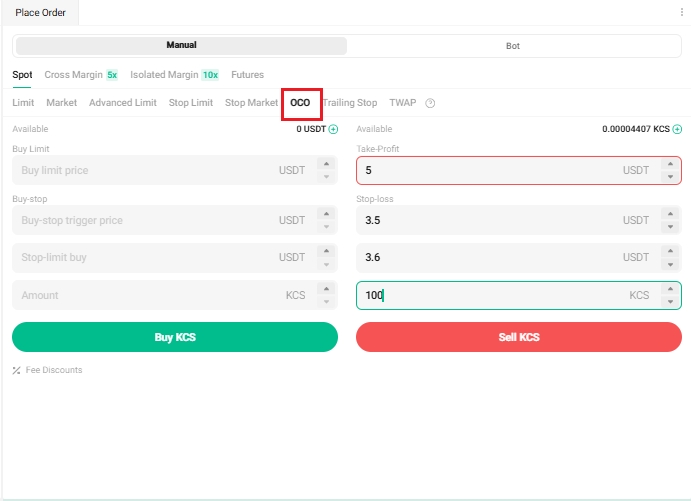 為此,選擇 OCO,將價格設置為 5 USDT,止損設置為 3.5 USDT(如果價格達到 3.5 USDT,則觸發限價單),限價設置為 3.6 USDT,數量設置為 100,然後點擊出售 KCS。