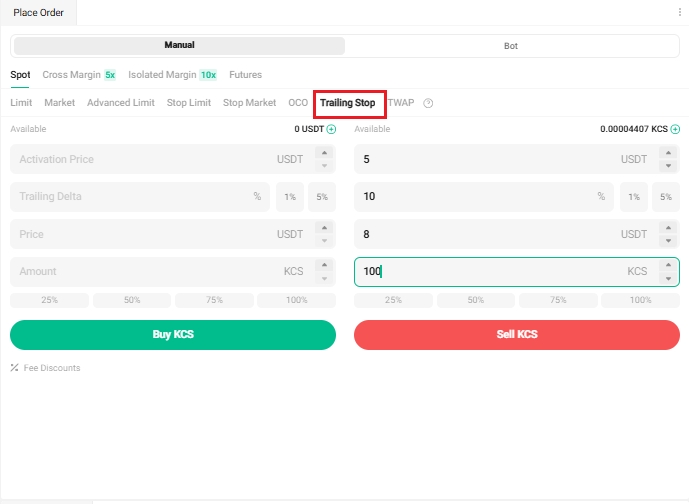 以 KCS/USDT 交易對為例,假設 KCS 的價格為 4 USDT。您預期KCS的價格將上升至5 USDT,並且在其繼續上升後,最多會回調至某一水平的10%再考慮再次賣出。為此,您將把賣出價格設置為8 USDT。您的策略是將賣出委託設置在8 USDT,並且只有當價格達到5 USDT並經歷10%的回調時才會再設置一個。