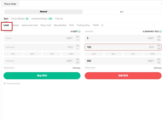 首先,您需要選擇限價,輸入5 USDT作為價格,100 KCS作為數量,然後點擊賣出KCS以確認您的訂單。