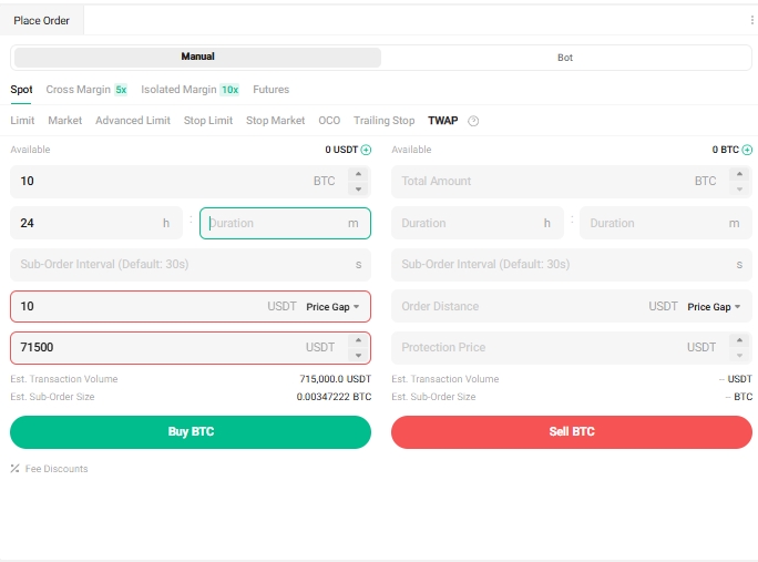 假設您希望快速以每 BTC 不超過 71,500 USDT 的成本買入 10 BTC,且不希望對市場價格產生重大影響。此時,您可以使用 TWAP 委託進行快速執行,設置如下: