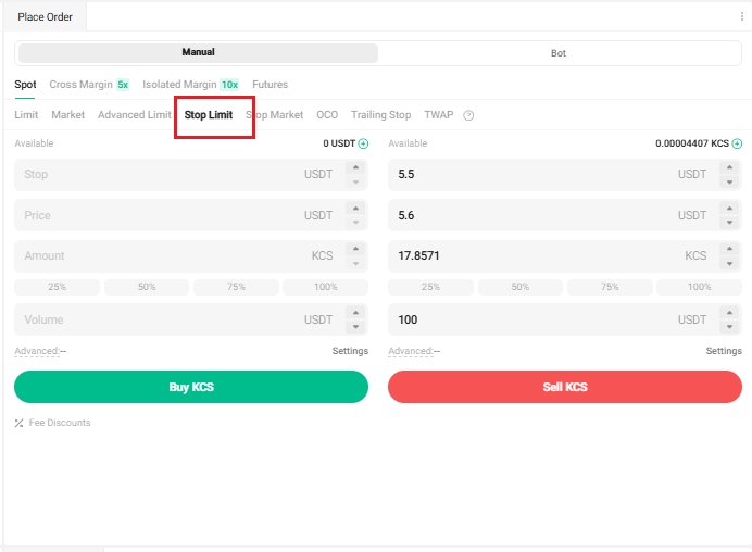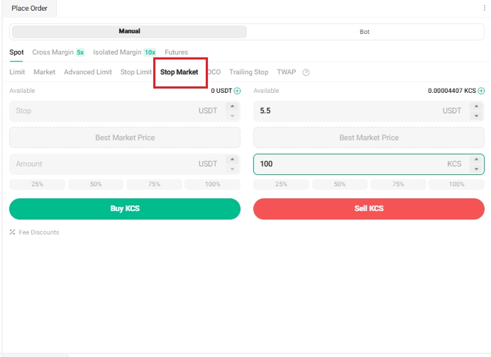 為此,您需要選擇 條件市價,設置止蝕價為 5.5 USDT,數量為 100 KCS,然後點擊 出售 KCS。當價格達到或超過 5.5 USDT 時,市價單觸發並以下一個可用的市場價格執行。