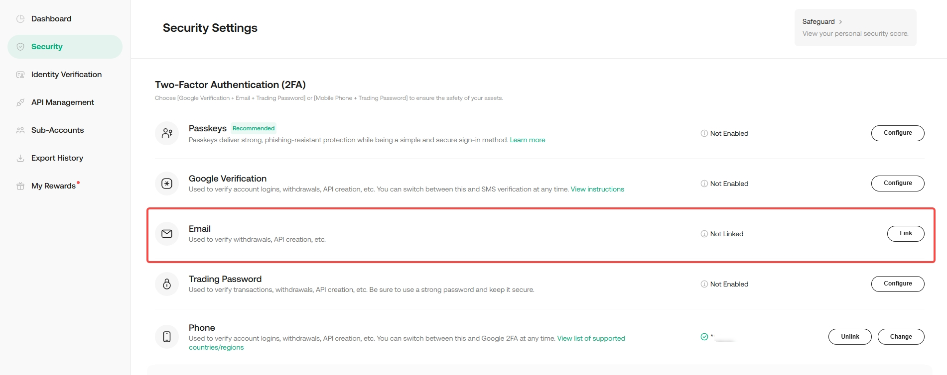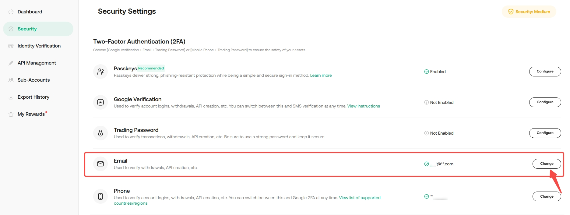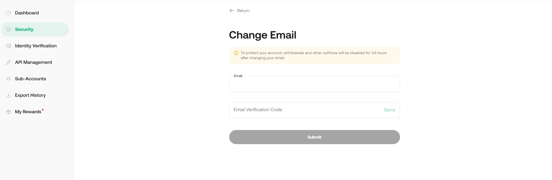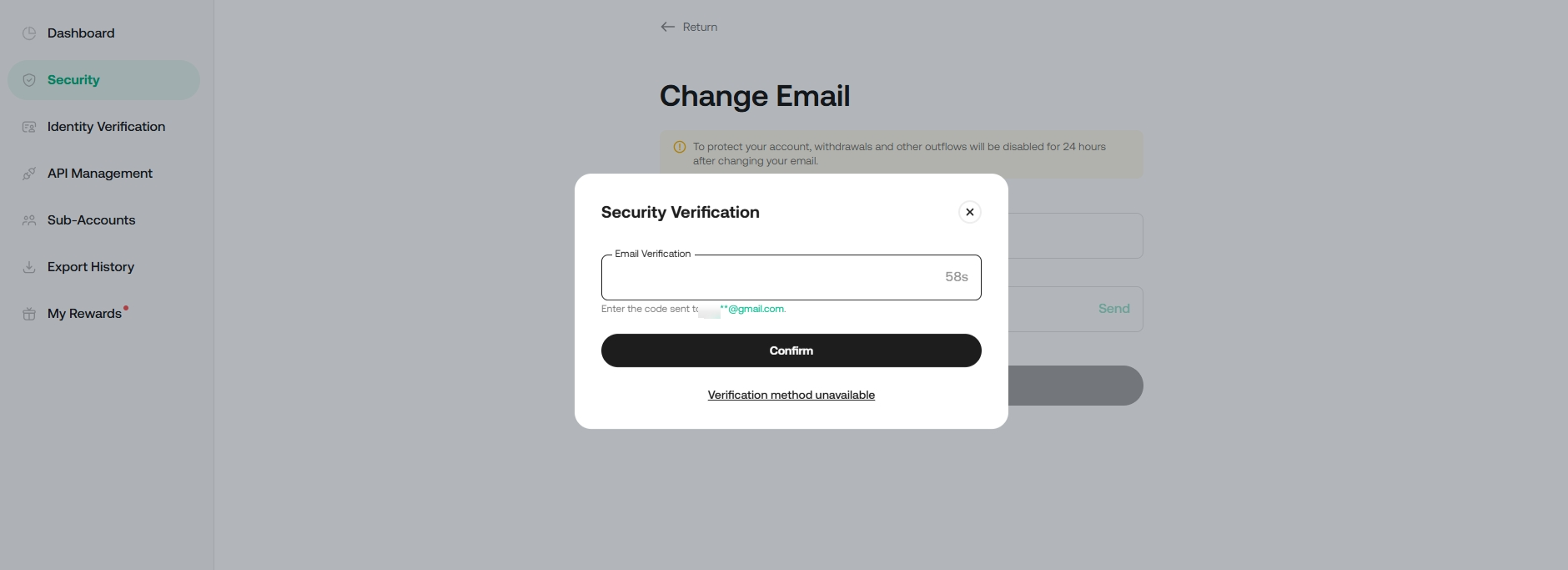 • 更改後,您的新電子郵件地址將立即生效。 為保障帳戶安全和資產,提現功能在更改電子郵件地址後的 24 小時內將被禁用。