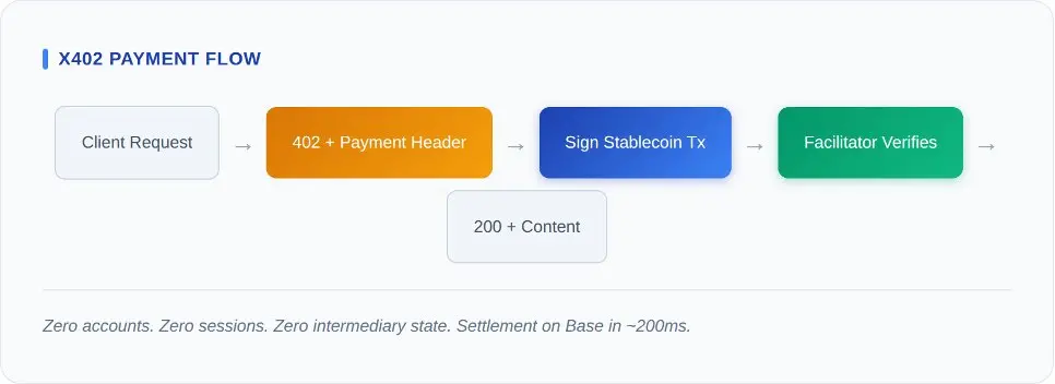 x402 協議可以用五行中間件代碼來解釋。客戶端請求一個資源。伺服器返回帶有支付請求頭的 HTTP 402。客戶端簽署一筆穩定幣轉賬,並帶著支付簽名重試。服務商在鏈上驗證結算。伺服器返回 HTTP 200。