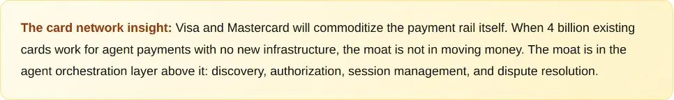 銀行卡網絡提供了第三層:規模化的合規與治理。Visa的代幣化憑證和萬事達卡的代理代幣將處理那些需要將人類現有財務關係擴展至其代理的情況。對於絕大多數消費者而言,他們授權的首筆代理支付將透過他們現有的Visa卡或萬事達卡完成,而非透過穩定幣錢包。這是一道簡單的算術題:40億張銀行卡對陣5000萬個穩定幣錢包。