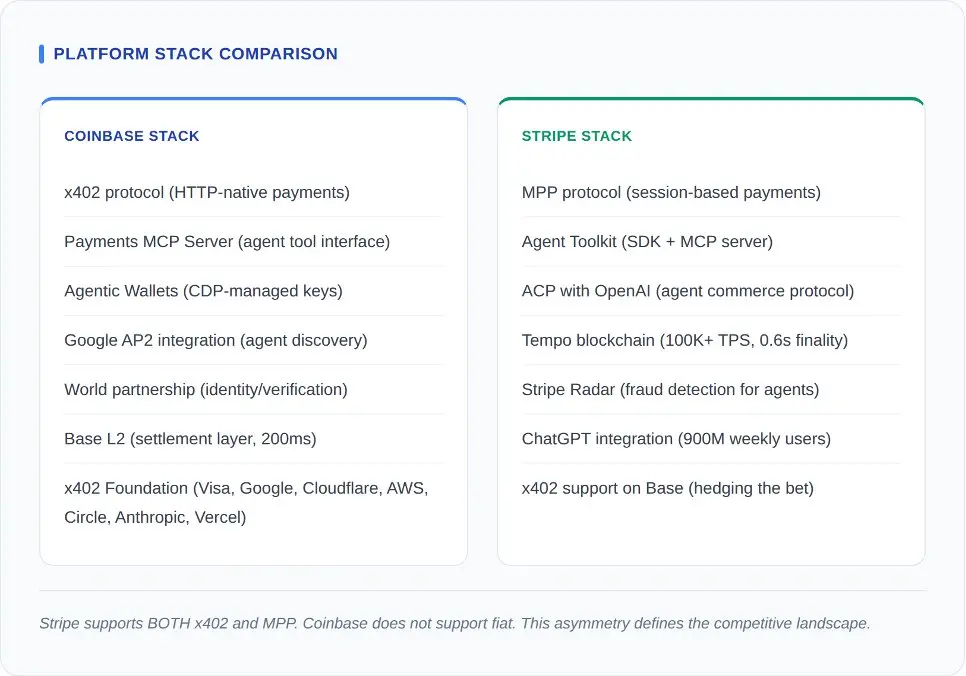 在這場對決中最關鍵的一筆,是 Stripe 陣營的最後一個動作。Stripe 支持在 Base 網絡上使用 x402。它通過在自己的企業級協議旁邊提供這種無需許可的協議來對沖風險。而 Coinbase 並沒有予以對等回應。在 Coinbase 的架構中沒有法幣支付的路徑。如果一個代理需要用信用卡支付,Coinbase 給不出解決方案。