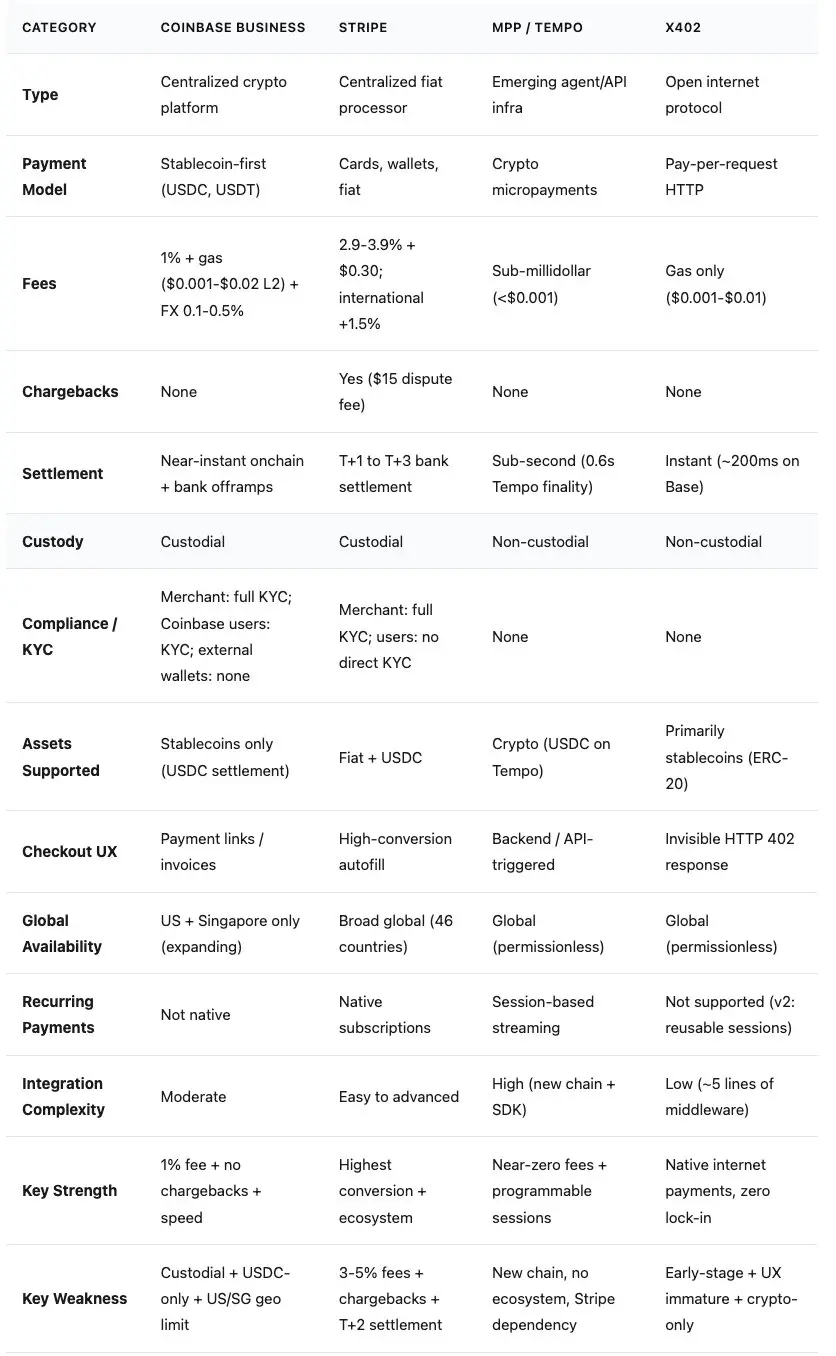 Coinbase 的反擊優勢在於其中立性。Stripe 作為一家支付處理商,有將交易保留在其平台上的商業動機。而 Coinbase 將 x402 建構為一個開放協議,並將治理權交給了基金會。但 Coinbase 的平台敘事卻很複雜:其 Commerce 產品將於 3 月 31 日下線,Coinbase Business 是託管式且僅限於美國和新加坡,並且結算時會自動將一切轉換為 USDC。這個開放協議是純粹的,但其背後的平台正處於遷移之中。