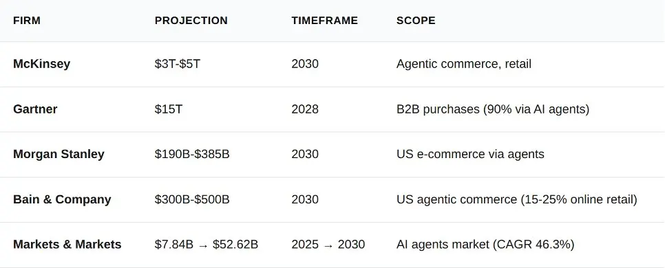 摩根士丹利的下限(1900 億美元)與 Gartner 的 B2B 數據(15 萬億美元)之間相差了兩個數量級。這種差距並非源於混亂,而是統計範圍的不同。摩根士丹利計算的是美國消費者電子商務。Gartner 計算的是全球所有 B2B 採購。即使是最保守的底線預估,其代表的市場規模也大於 Stripe 2023 年全年的處理總量(1 萬億美元)。