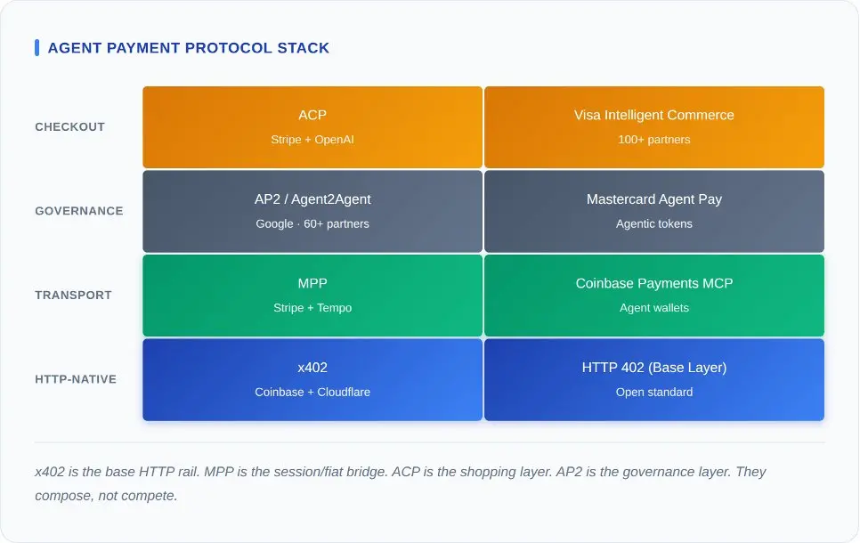 最快誤解代理支付的方式,就是將每個協議的公告並列排比,然後問「哪個最好」。這些協議位於同一技術堆棧的不同層級。將它們混為一談,就像拿 TCP 協議去和 Shopify 做比較。