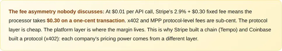 對於 x402 和 MPP 而言,其潛台詞是相同的。這兩種協議都需要在消費者普及之前先獲得企業的採用。消費者不選擇支付軌道,商家才做選擇。而商家選擇軌道的依據是詐欺率、結算速度和拒付責任,而非協議的優雅程度。