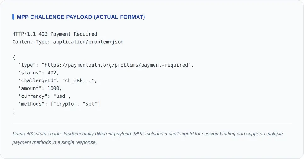 MPP 在單一協議中支援 USDC、信用卡、借記卡、先買後付以及數位錢包。在 Base 網絡上使用 USDC 支付的代理和使用 Visa 公司卡支付的代理,會訪問同一個端點並收到相同的收據。大多數企業採購仍透過信用卡進行。一個強制只接受加密貨幣的支付協議,是絕大多數 CFO 不會批准的支付協議。