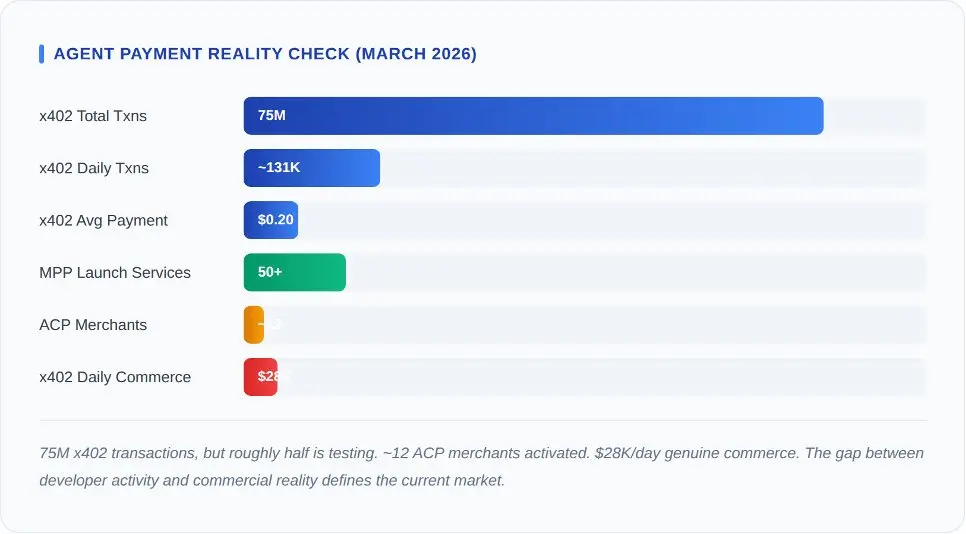 截至2026年3月的鏈上數據:日均交易量約13.1萬筆,日均交易額約2.8萬美元,平均支付金額為0.20美元。據CoinDesk的取證分析(2026年3月11日)估計,其中約一半是開發者的測試和集成探測。年化總交易額約為1000萬美元。剔除測試後的年化真實商業交易額約為500萬美元。對於一個由Coinbase、Cloudflare、Visa和谷歌支持的協議來說,這只是一個種子輪階段的數據。協議本身運作良好,只是市場尚未到來。