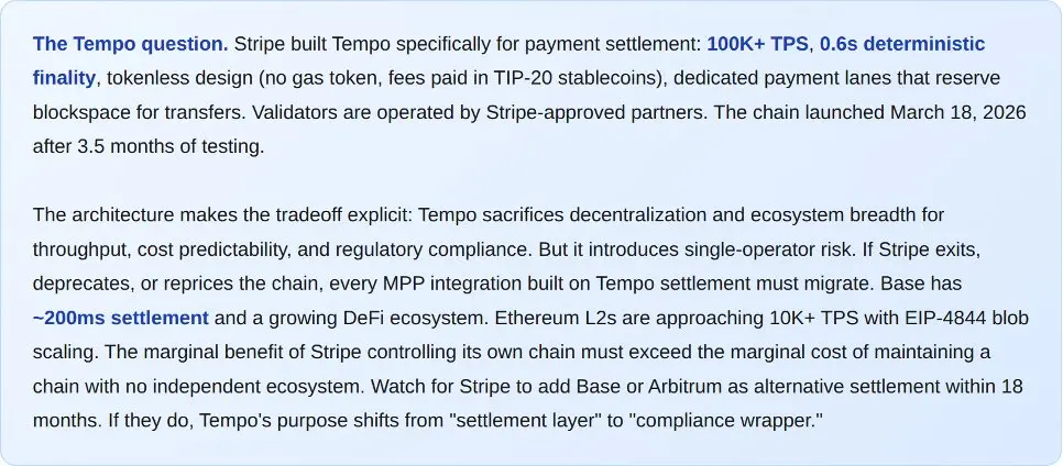 MPP 的底層是 Tempo,這是一條於 2026 年 3 月 18 日推出的專用區塊鏈。其規格為:10 萬以上的 TPS,0.6 秒的最終確定性,無代幣設計(沒有 Gas 代幣,沒有原生加密貨幣)。驗證節點由 Stripe 批准的合作夥伴運營。這種權衡是顯而易見的:Tempo 牺牲了去中心化,換取了吞吐量、成本可預測性和監管合規性。Stripe 對此也毫不掩飾。