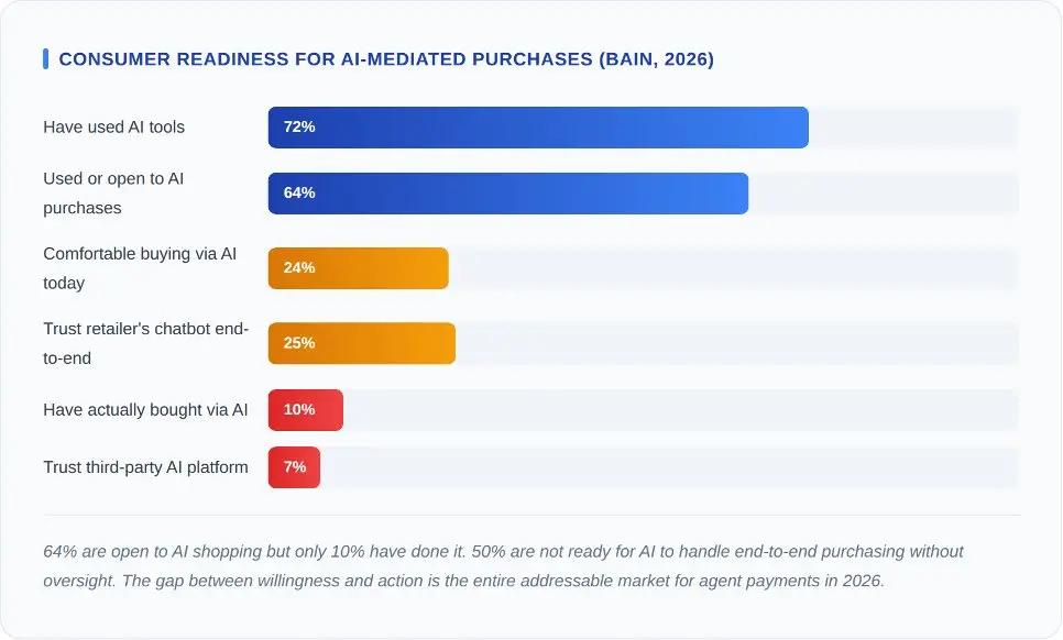 但以下這個數字應該讓這個領域的每一位開發者感到如芒在背:只有7%的消費者信任第三方AI平台為他們購物(據貝恩2026年對2016名美國受訪者的調查)。支付協議已經準備就緒。基礎設施已經準備就緒。但人類還沒有準備好。