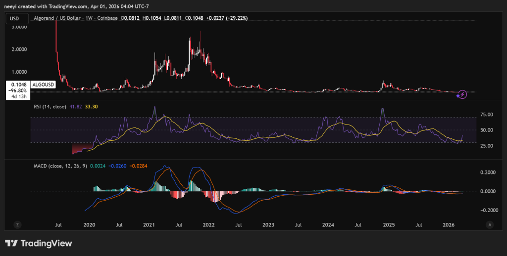 圖表上最重要的區間位於 $0.08 至 $0.09 之間。該區域目前作為支撐位,與近期低點及短期移動平均線對齊。若 ALGO 價格在週線收盤時維持在該區間上方,圖表可能形成基底,使價格在指標穩定後於 $0.09 至 $0.14 區間內波動。