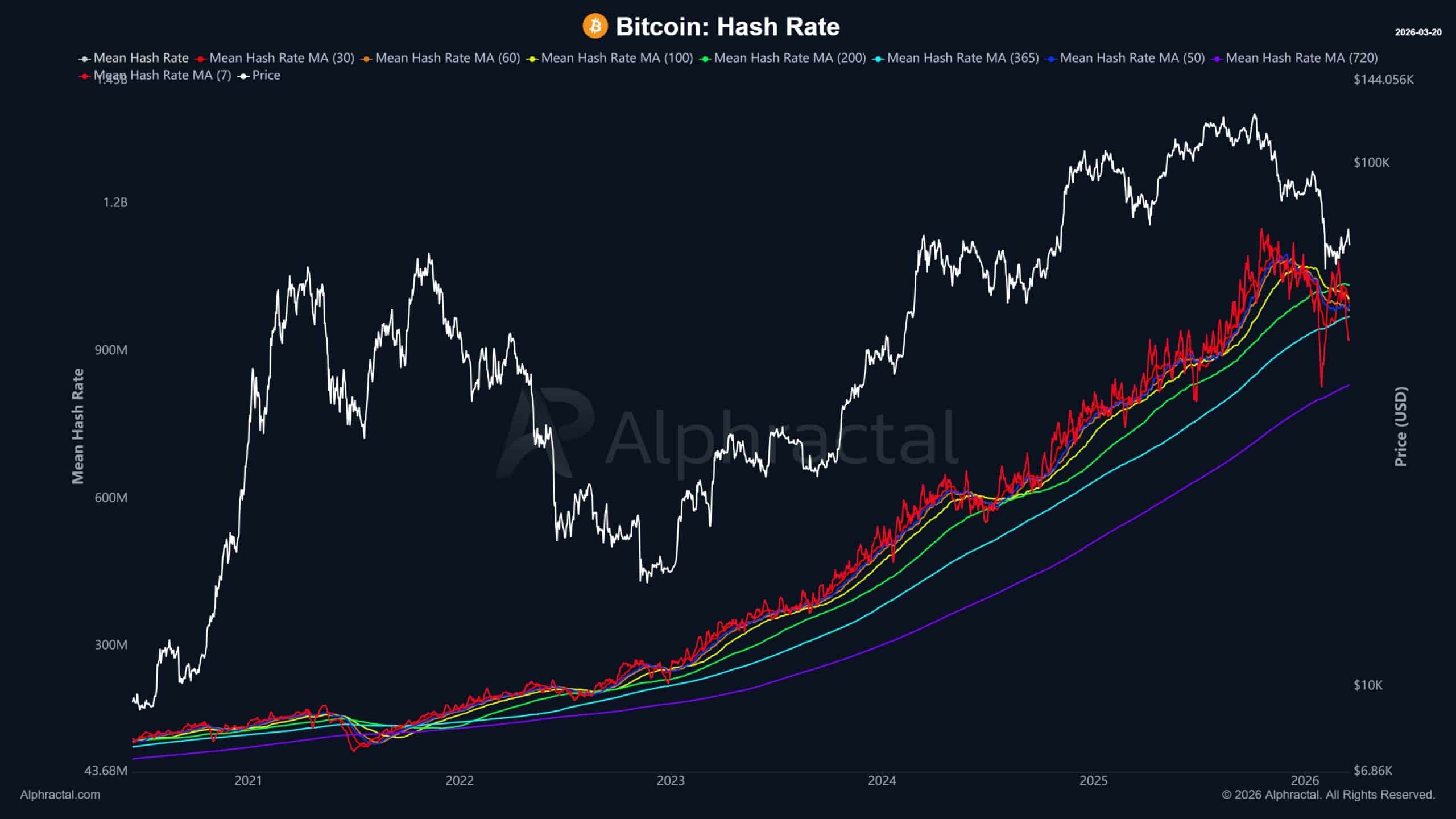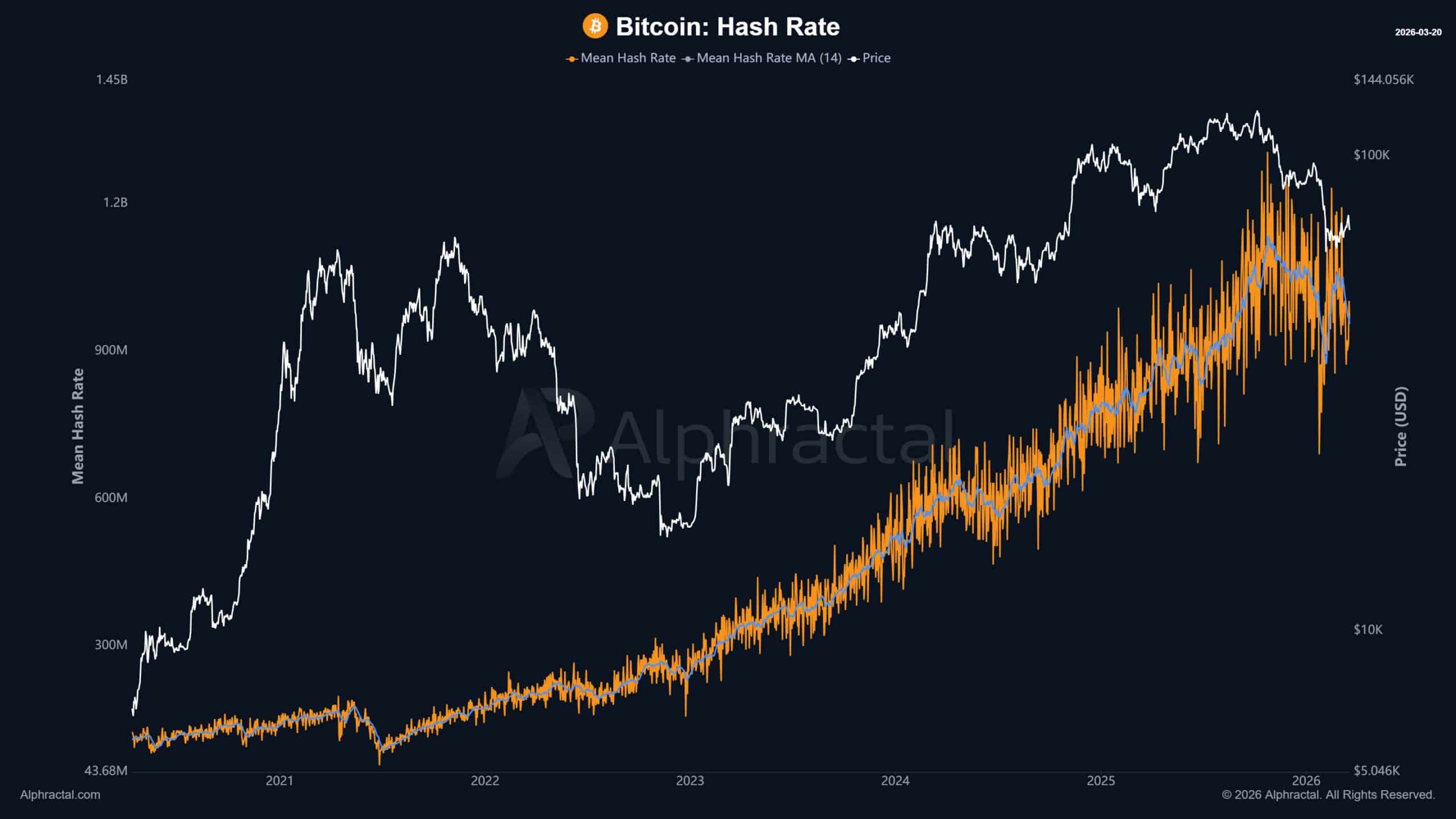 - 比特幣挖礦算力降至 904 EH/s,價格穩定在 70,000 美元附近,顯示礦工透過關閉設備進行風險減緩,而非主動拋售。