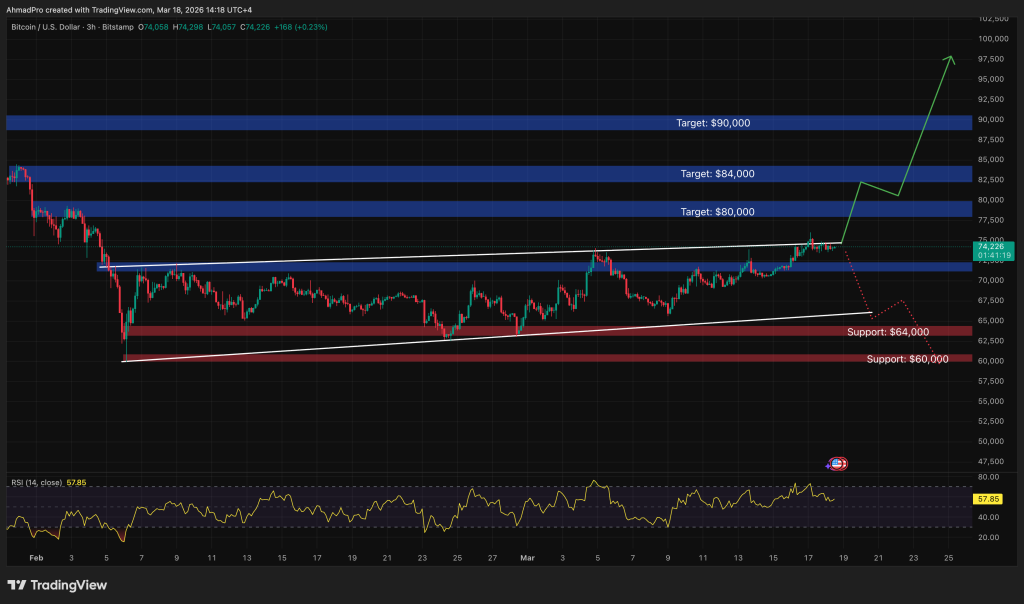 比特幣正在測試 69,000 美元至 74,000 美元的阻力區間。若能穩固收於其上,則確認漲勢成立;若無法守住,則此波動越來越像多頭陷阱。