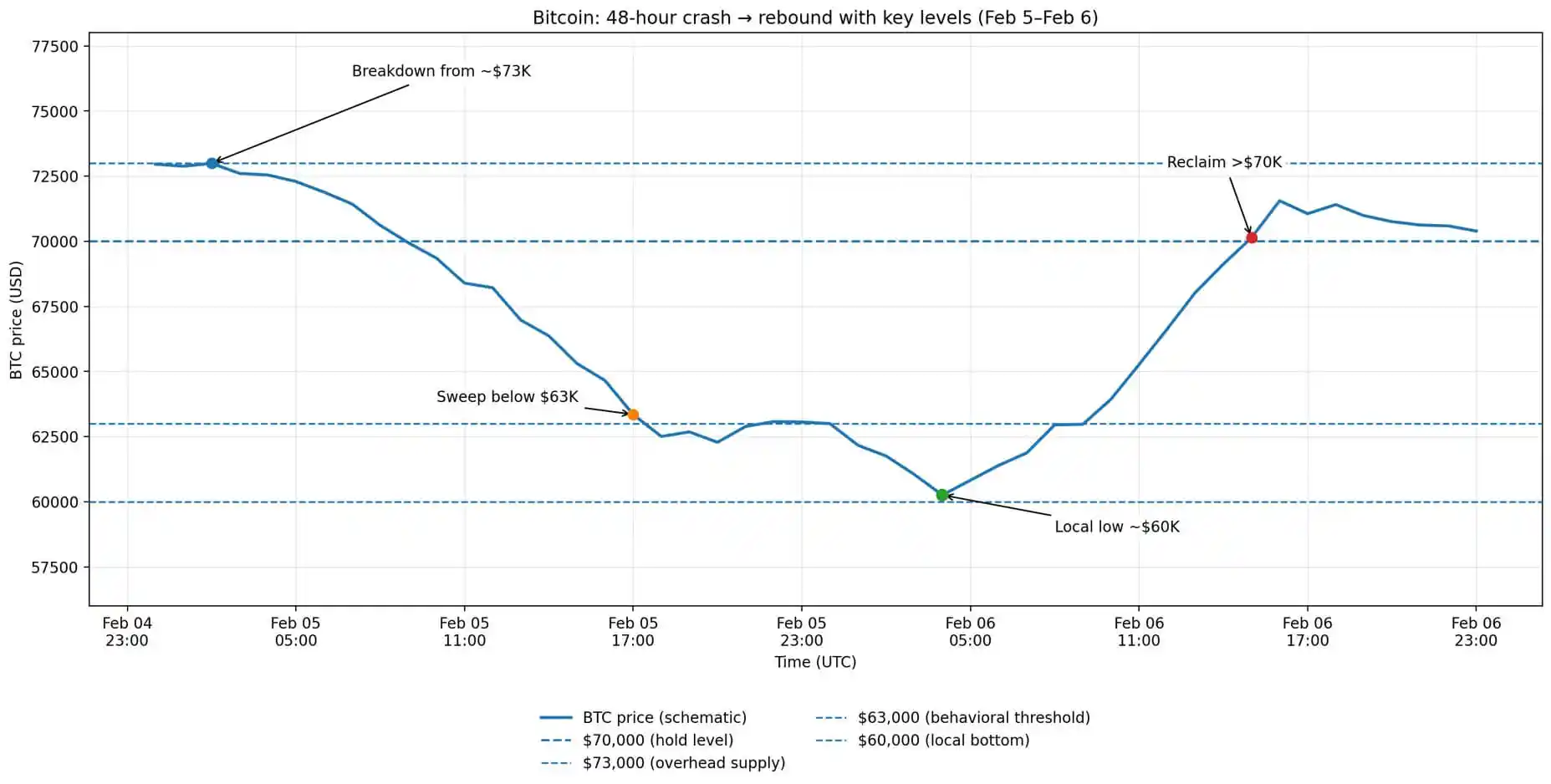 比特幣 48 小時內的價格走勢,顯示了從 73,000 美元的崩盤、跌破 63,000 美元的掃損、60,000 美元附近的局部築底,以及隨後回升至 70,000 美元上方的反彈。